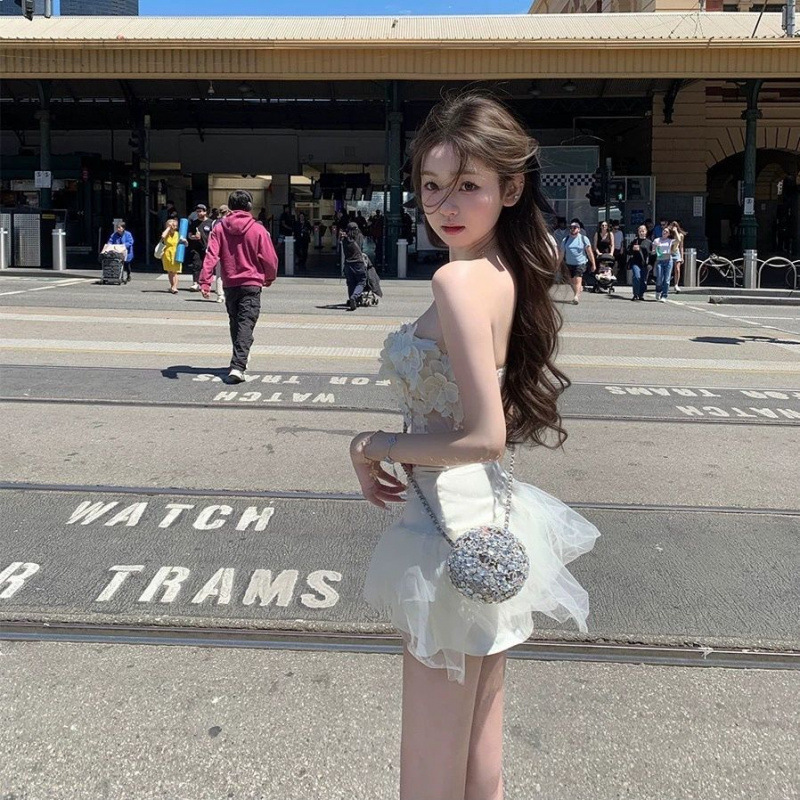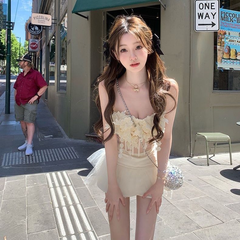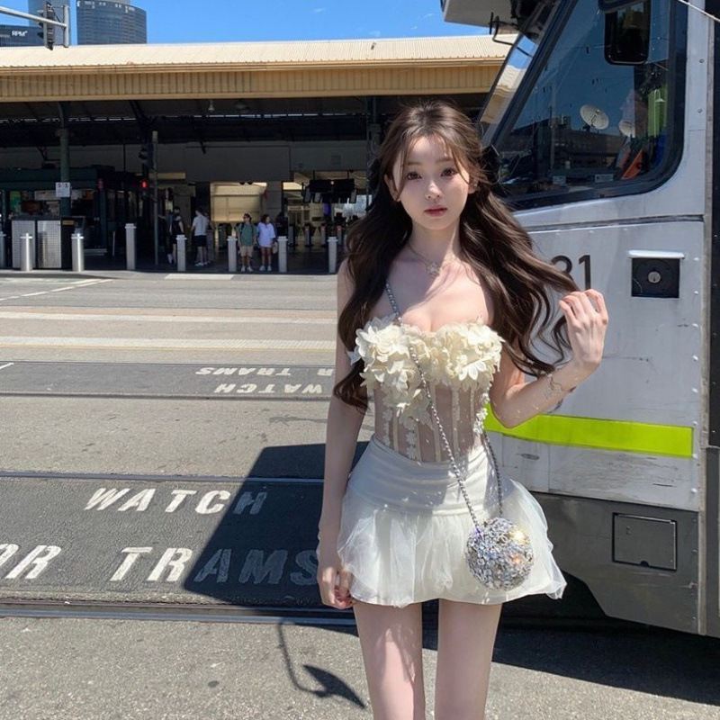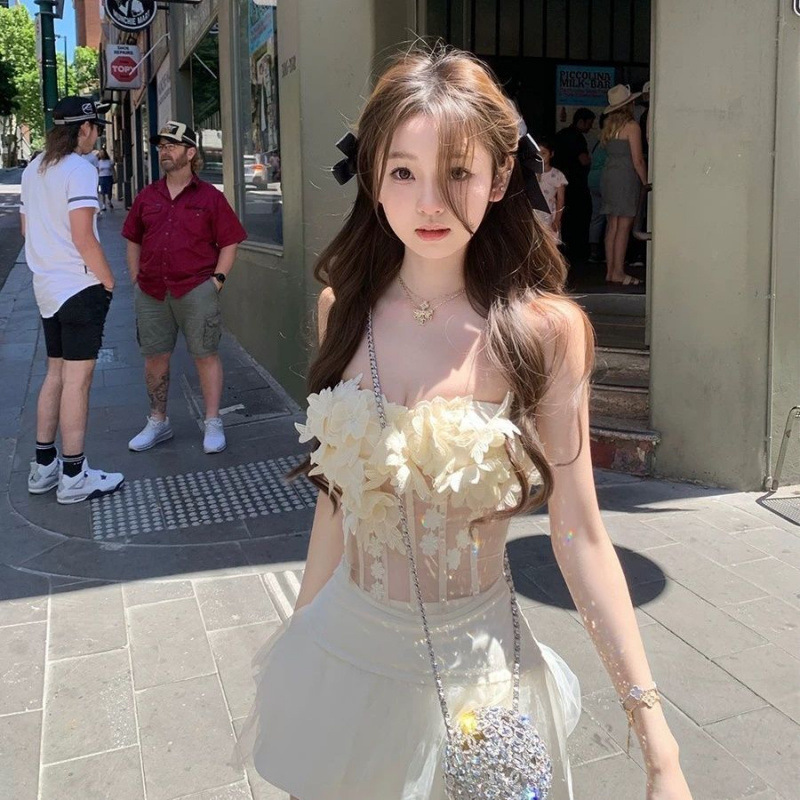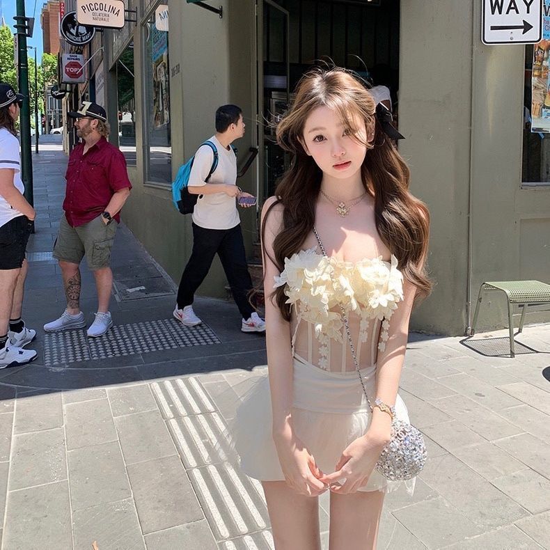 섹시한 핫걸 모조 생선뼈 메쉬 약간 반투명한 입체 꽃 튜브 탑 슈퍼 요정 슬리밍 메쉬 조끼 여성용스토어 가기