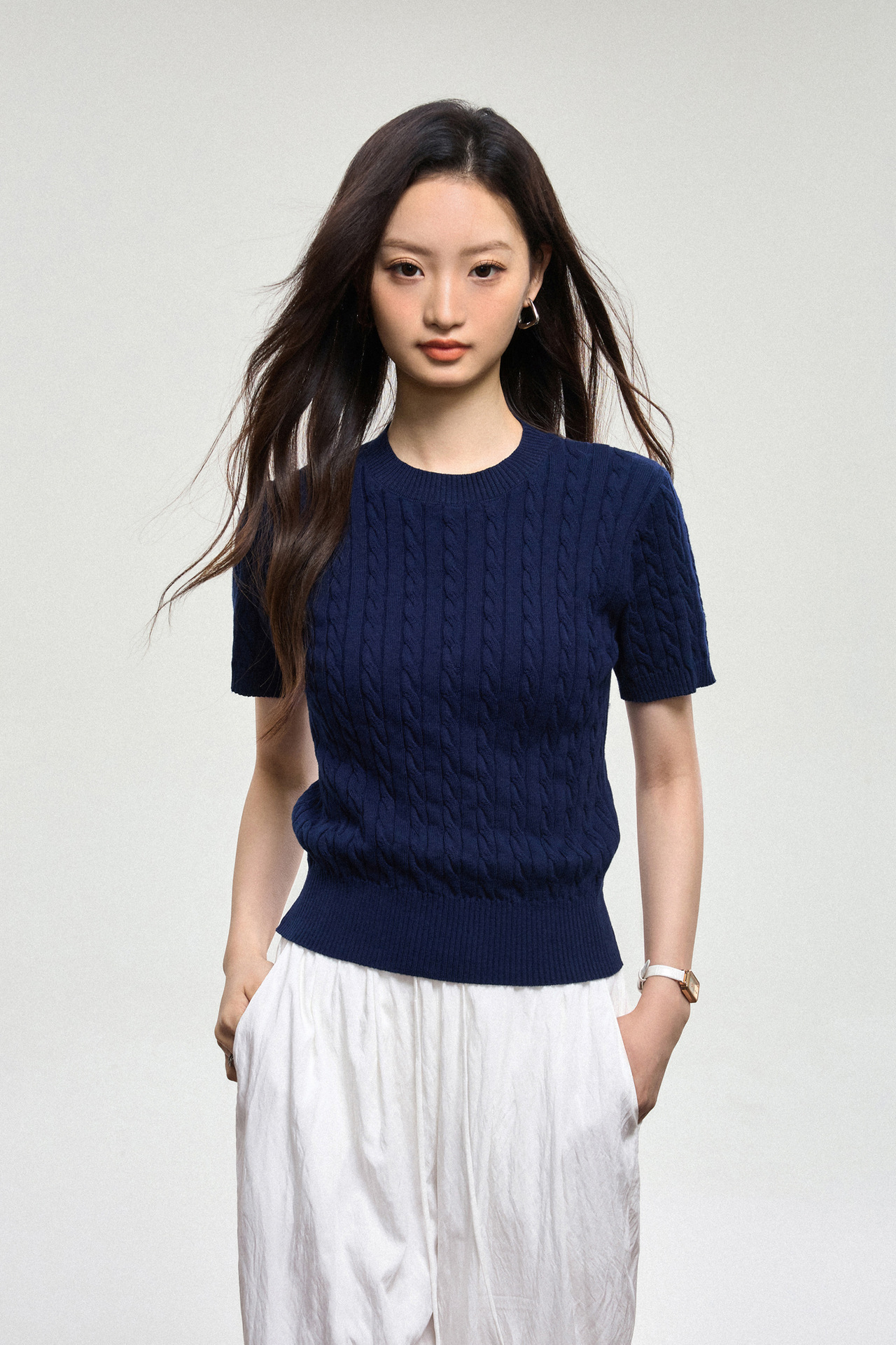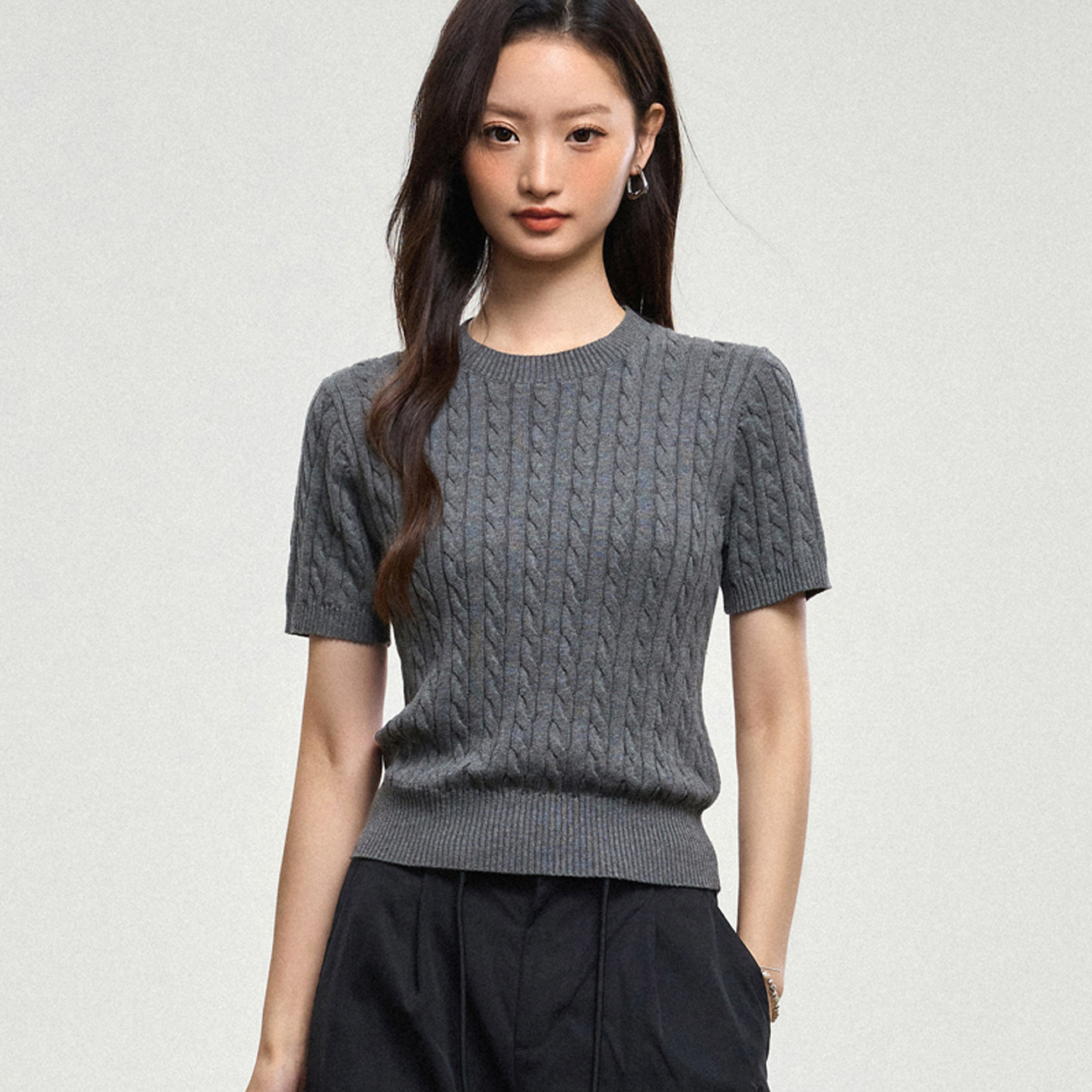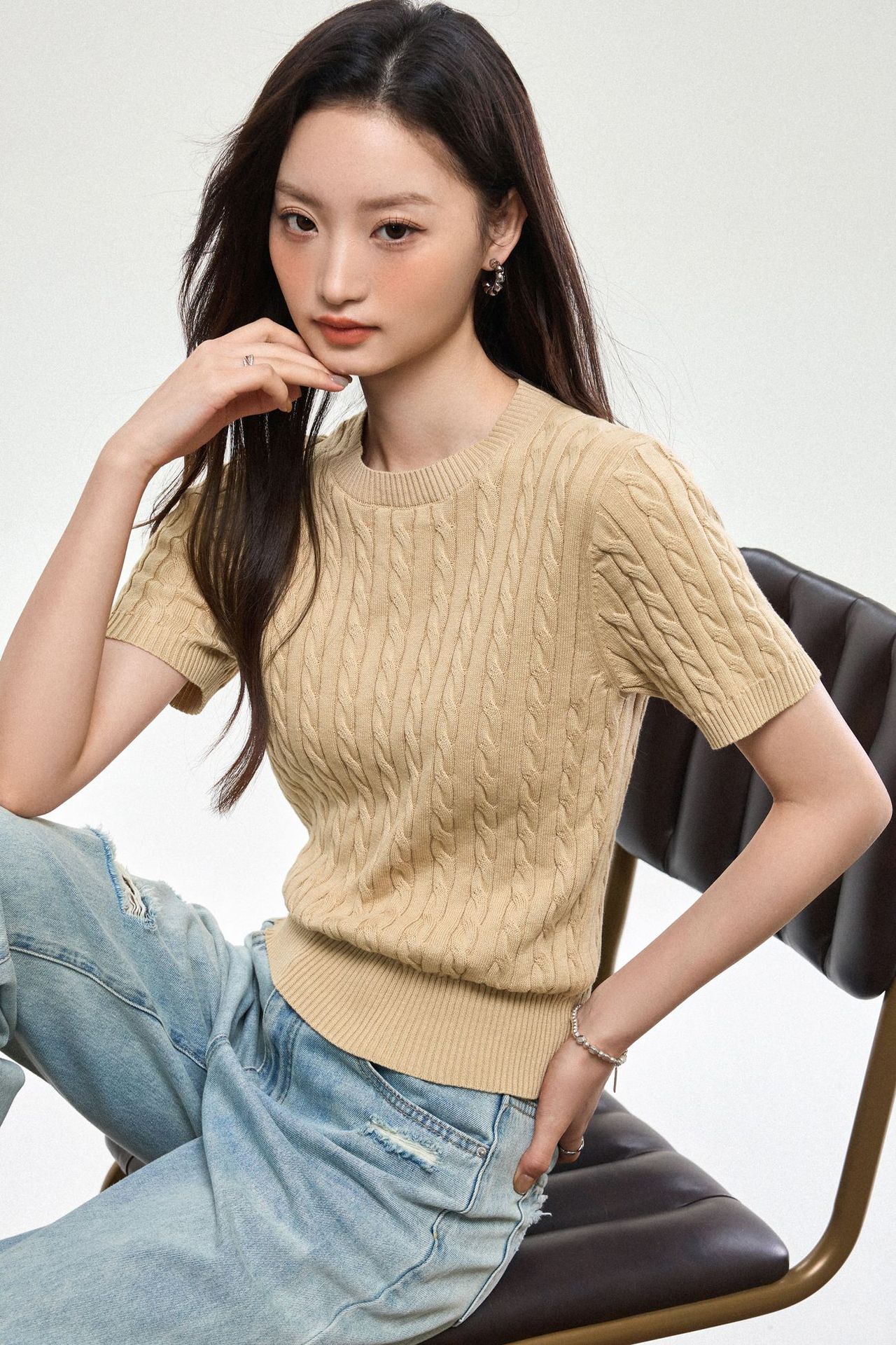 여성을위한 100% 면 스웨터 여름 새로운 스타일 고급 슬리밍 트위스트 슬리밍 반팔 라운드 넥 탑 얇은 스타일스토어 가기