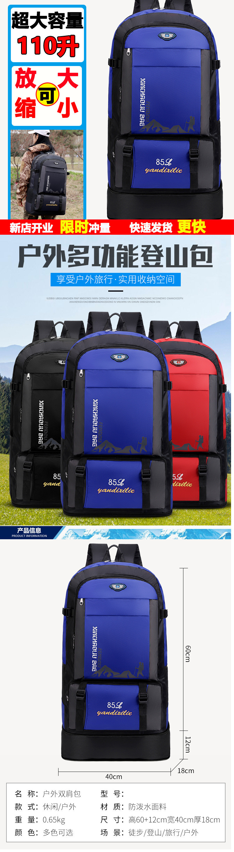 110리터 초대형 배낭 남학생 학교 가방 야외 스포츠 등산 가방 귀국 작업 수하물 배낭스토어 가기