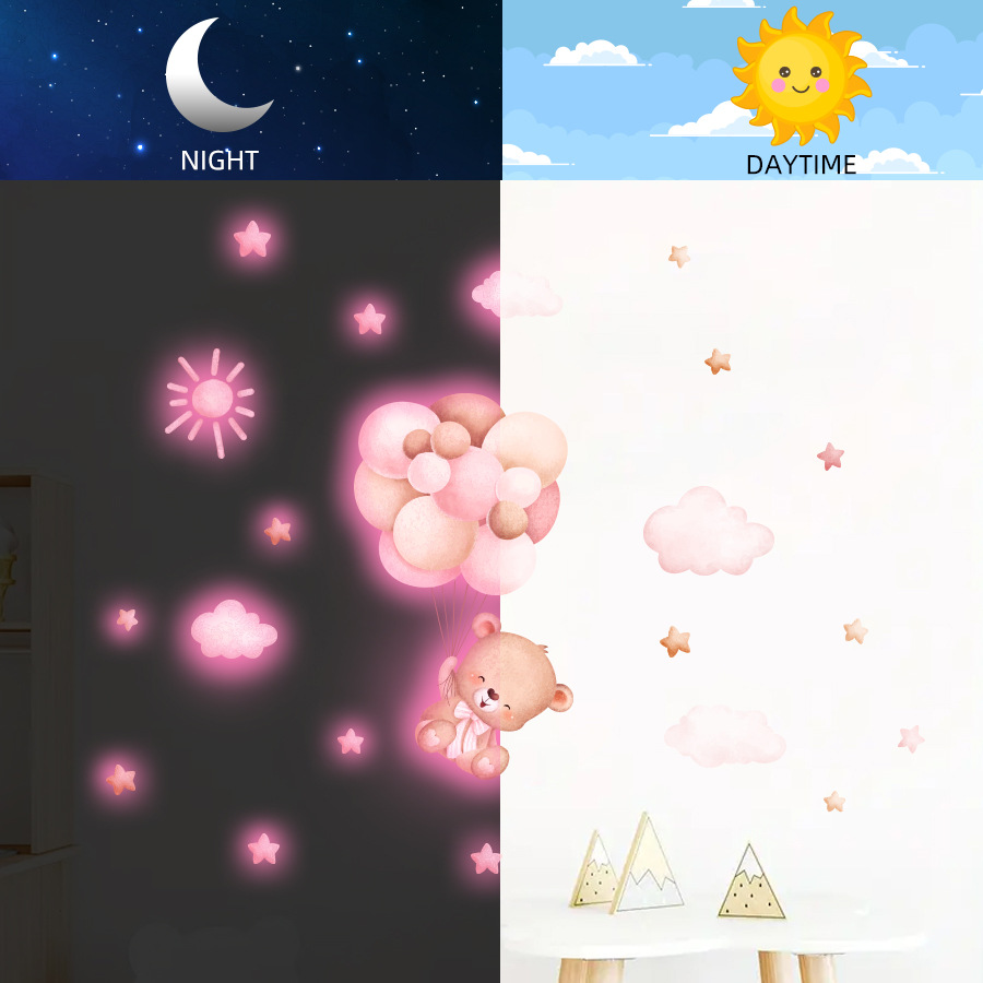 BR-YG103C 풍선 곰 별이 빛나는 하늘 구름 만화 스티커 벽 스티커 어린이 방 자체 접착 발광 장식 스티커