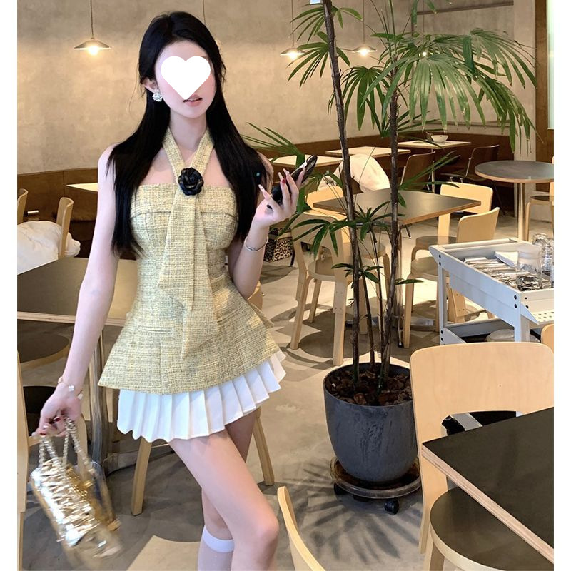 Xiaoxiangfeng 달콤하고 매운 스커트 슈트 Pure Desire 홀터넥 탑 + 하이 패션 감년 주름 스커트 투피스 세트스토어 가기