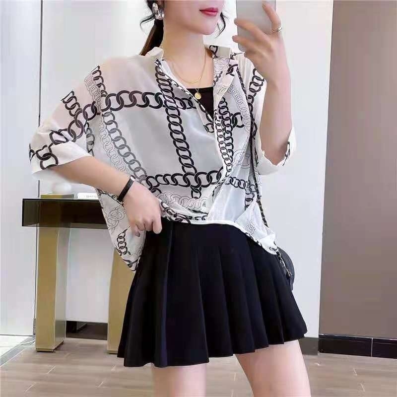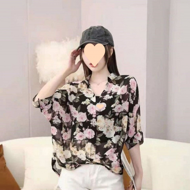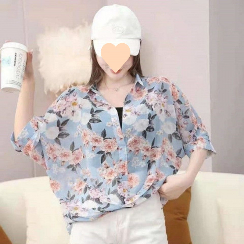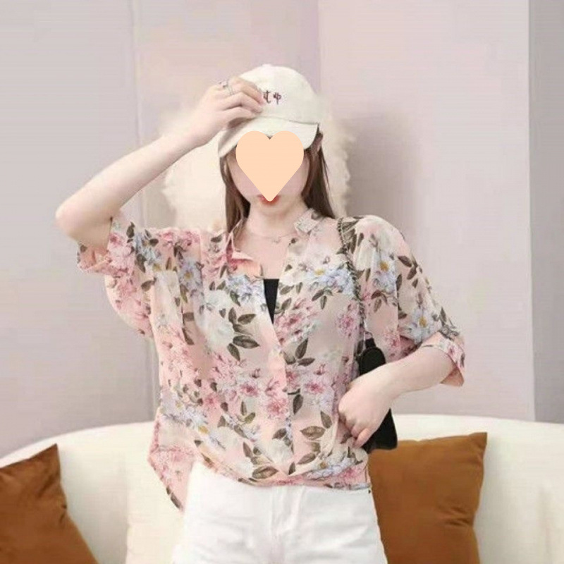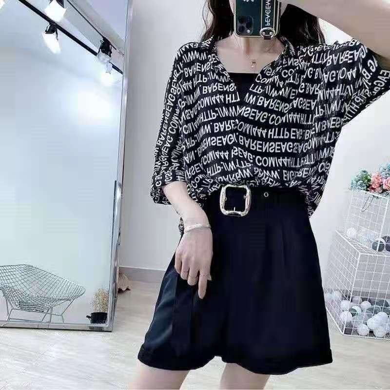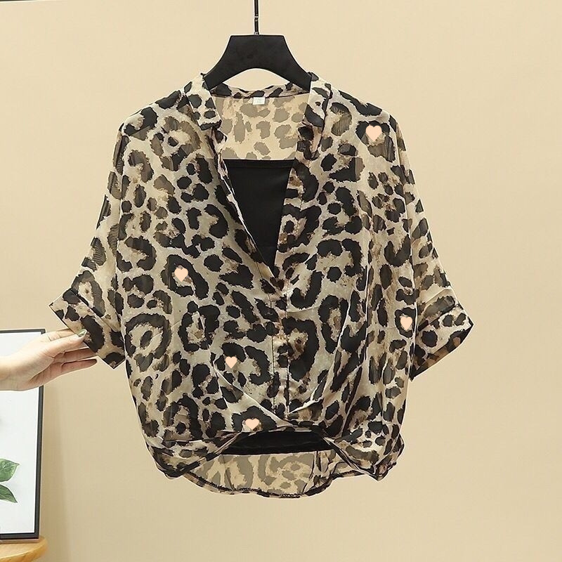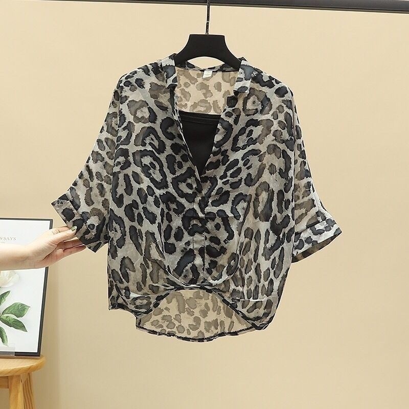 여성용 쉬폰 셔츠 투피스 세트 여름 느슨한 반팔 허리 탑 새로운 작은 꽃 무늬 셔츠 레오파드 프린트 탑스토어 가기