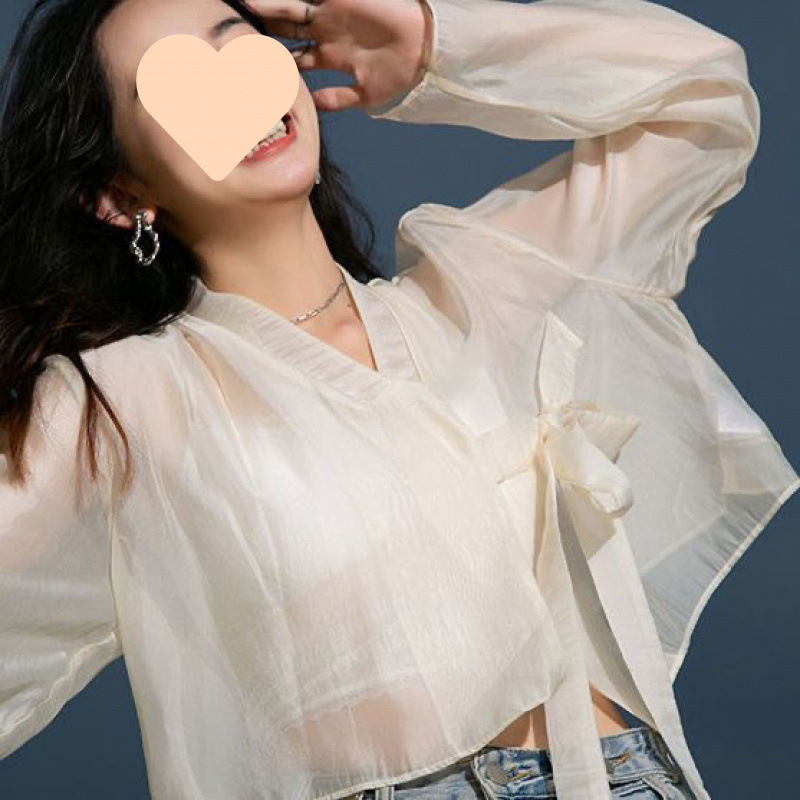 2025 봄 여름 Hanfu 중국 스타일 쉬폰 긴팔 칼라 약간 투명한 레이스 업 카디건 탑