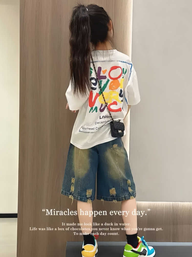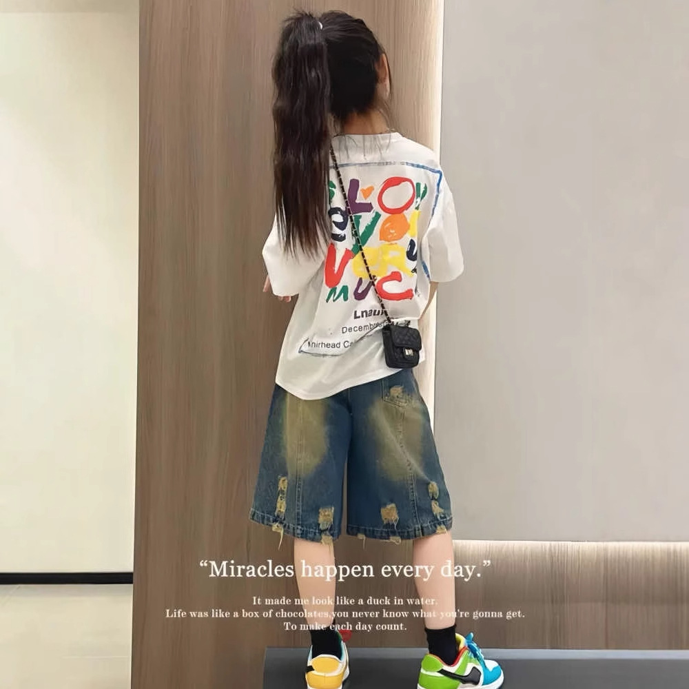 큰 어린이를 위한 여아 여름 반팔 양복, 트렌디하고 멋진 순면 그래피티 티셔츠, 스트리트 데님 바지, 여름 투피스 세트