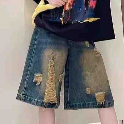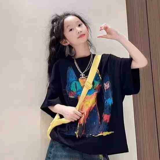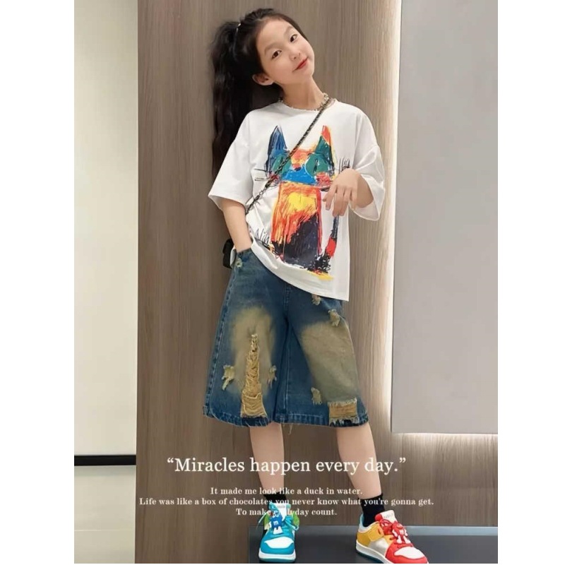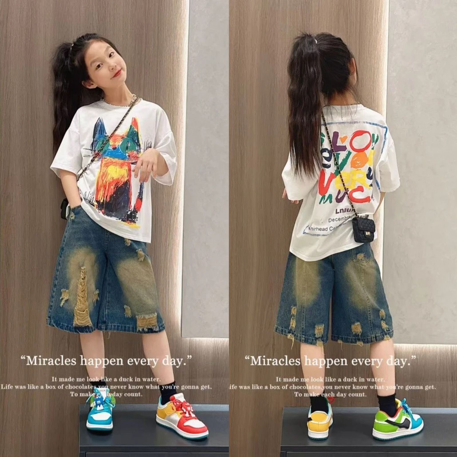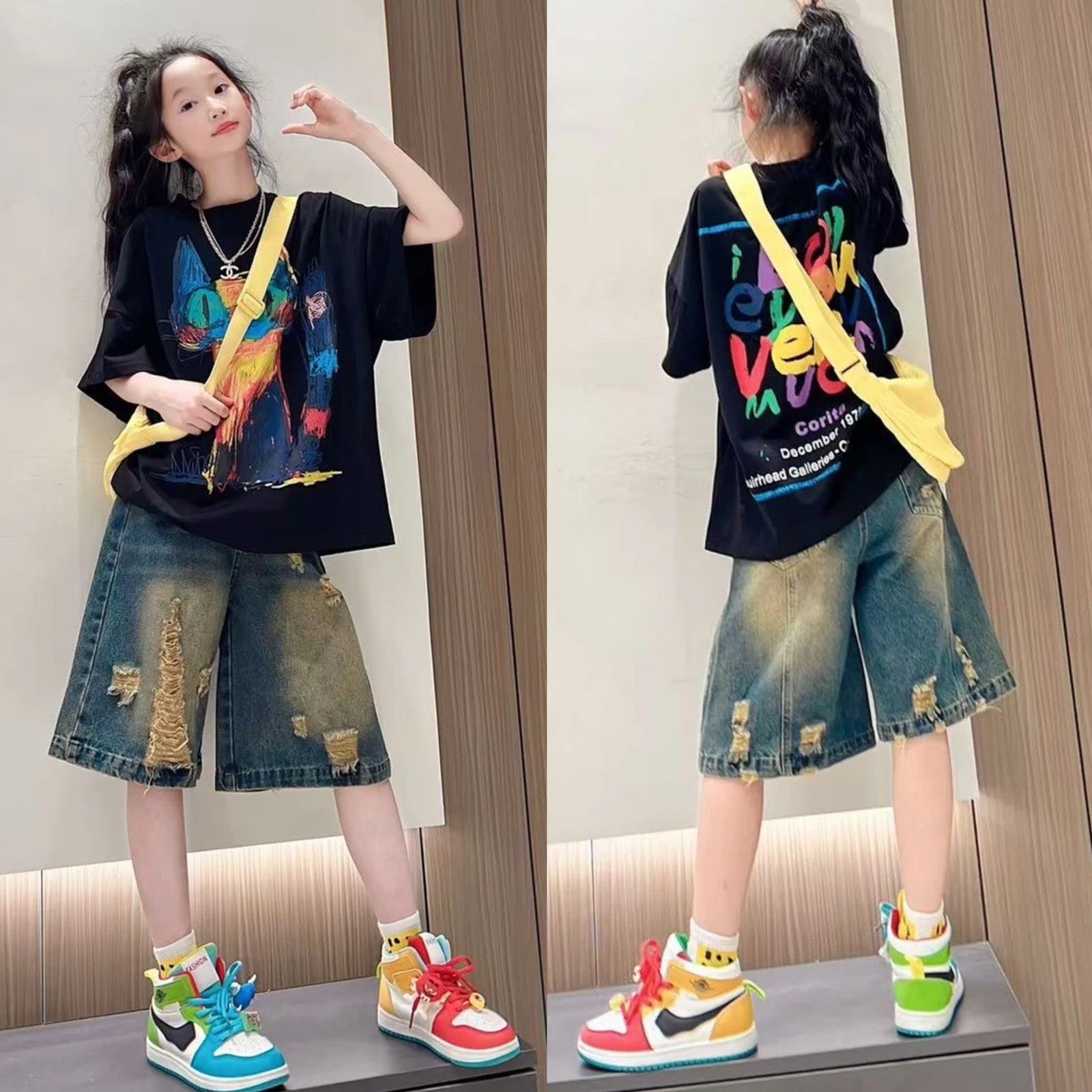 큰 어린이를 위한 여아 여름 반팔 양복, 트렌디하고 멋진 순면 그래피티 티셔츠, 스트리트 데님 바지, 여름 투피스 세트스토어 가기