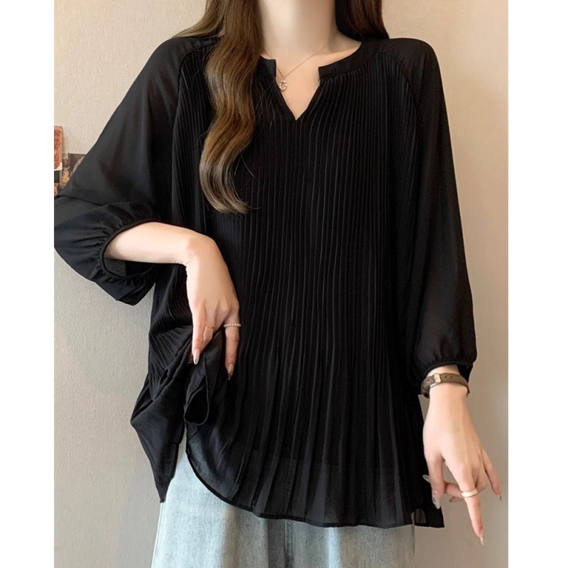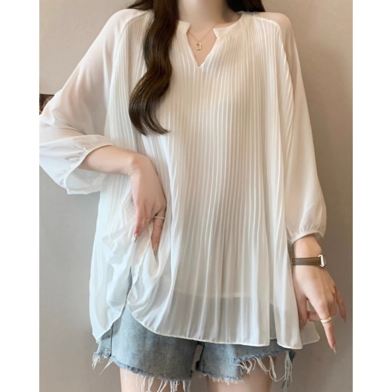 플러스 사이즈 여성용 프렌치 러플 배 커버 반팔 쉬폰 셔츠 여성용 여름 뚱뚱한 루즈 슬리밍 셔츠 탑스토어 가기
