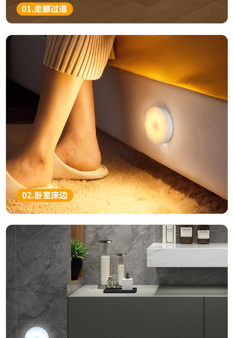 초박형 자기 유도등, 충전식 조명 제어 옷장 조명, 펀치 없는 설치, 매우 긴 배터리 수명의 계단 발 조명스토어 가기