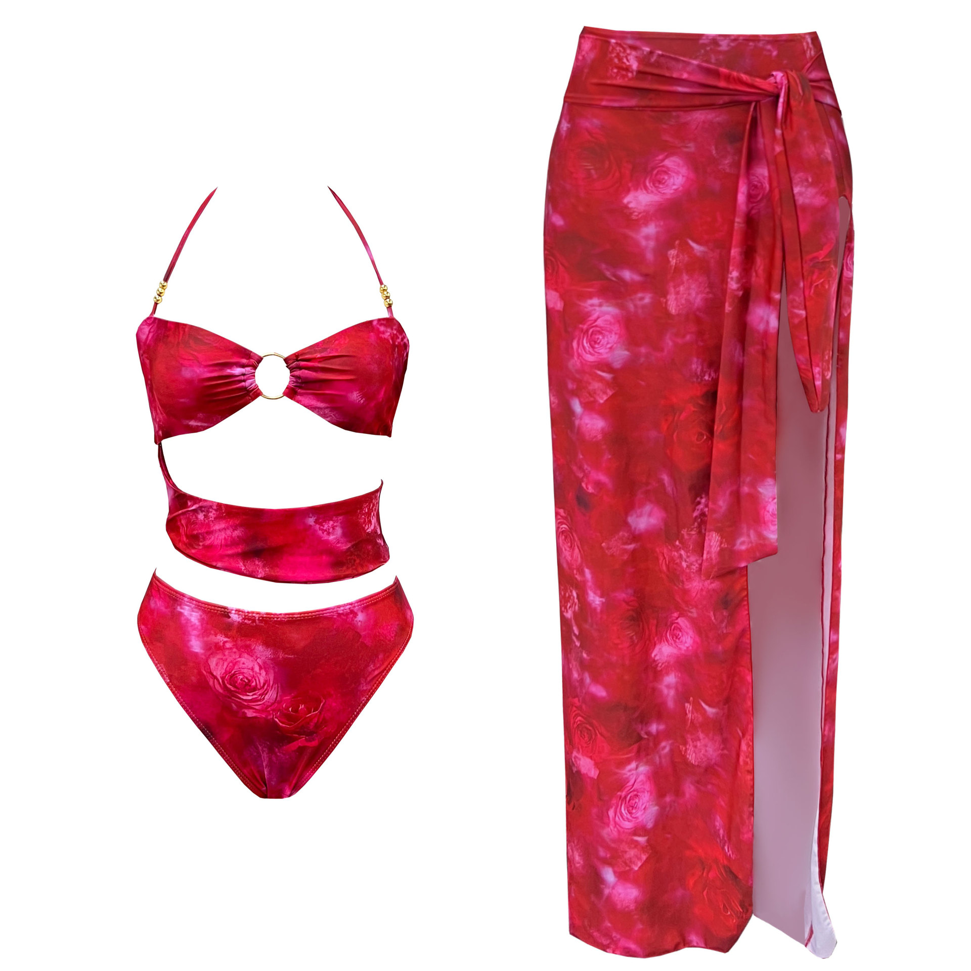 2025 새로운 복고풍 컬러 인쇄 멀티 로프 중공 섹시한 원피스 수영복 여성 하프 길이 원피스 스커트 슈트