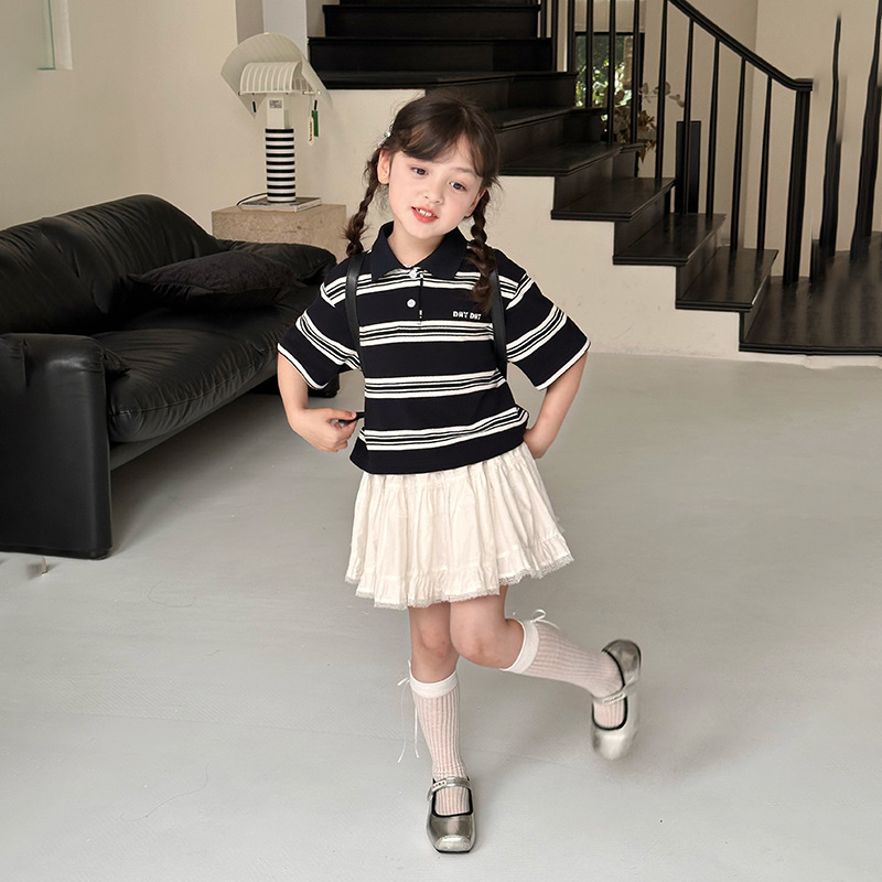 Elmo Beibei 소년 소녀 여름 스타일 유니섹스 스타일 루즈한 대비 컬러 티셔츠 라펠 폴로 스트라이프 반팔 탑스토어 가기