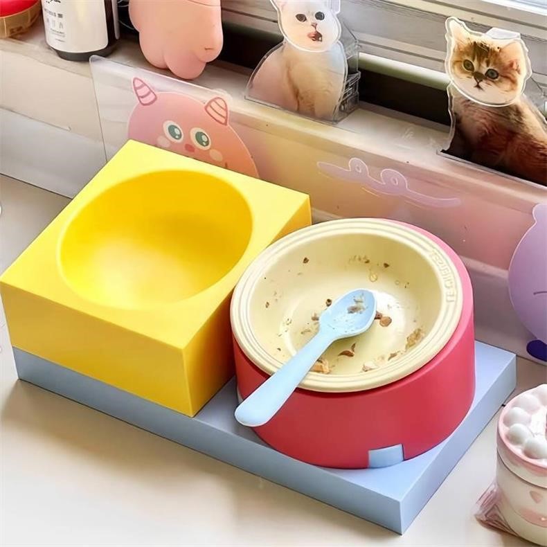 도파민 애완동물 빌딩 블록 고양이와 개 그릇 작은 개 식사 그릇 밥과 물 이중 그릇은 넘어짐을 방지하고 경추를 보호합니다.스토어 가기