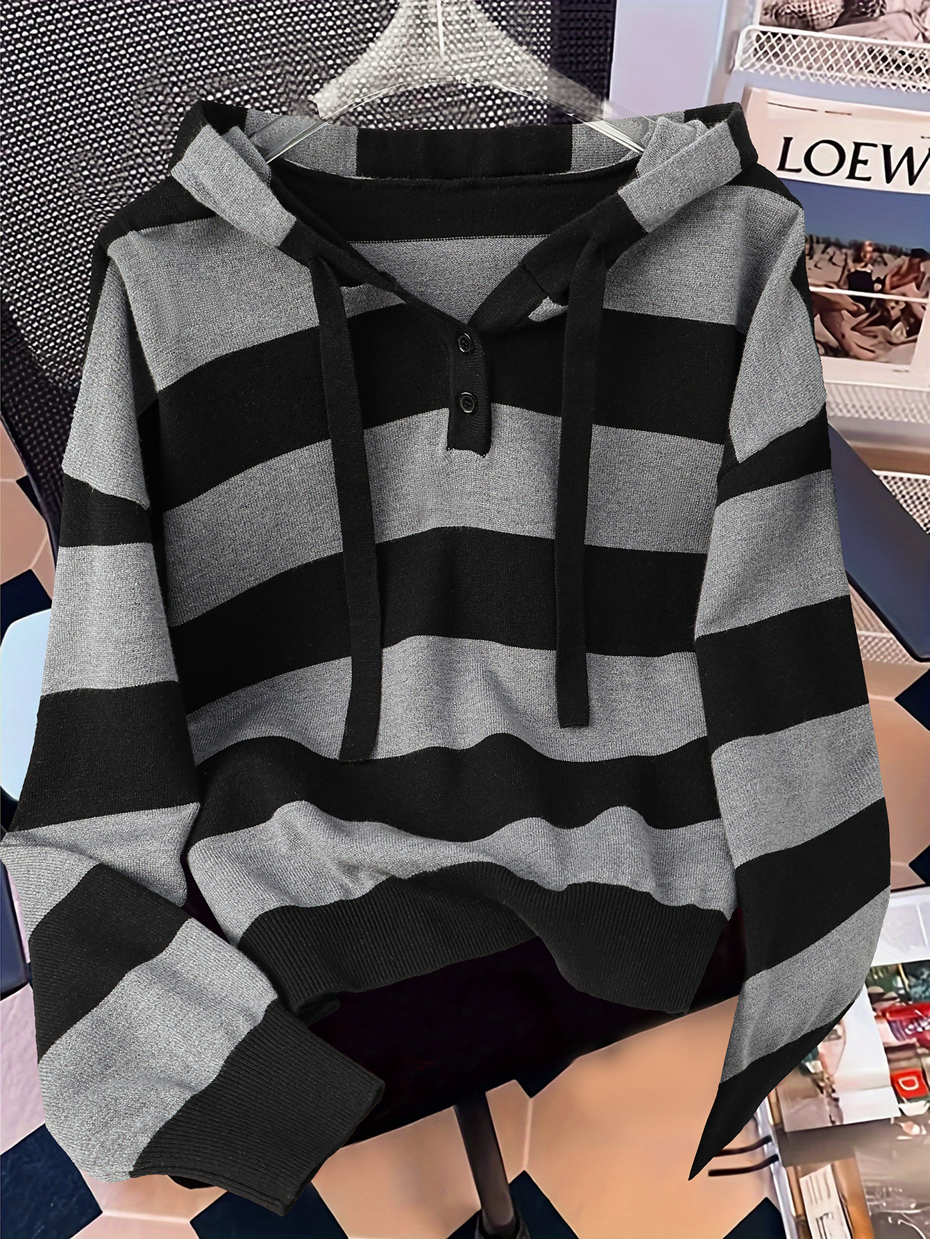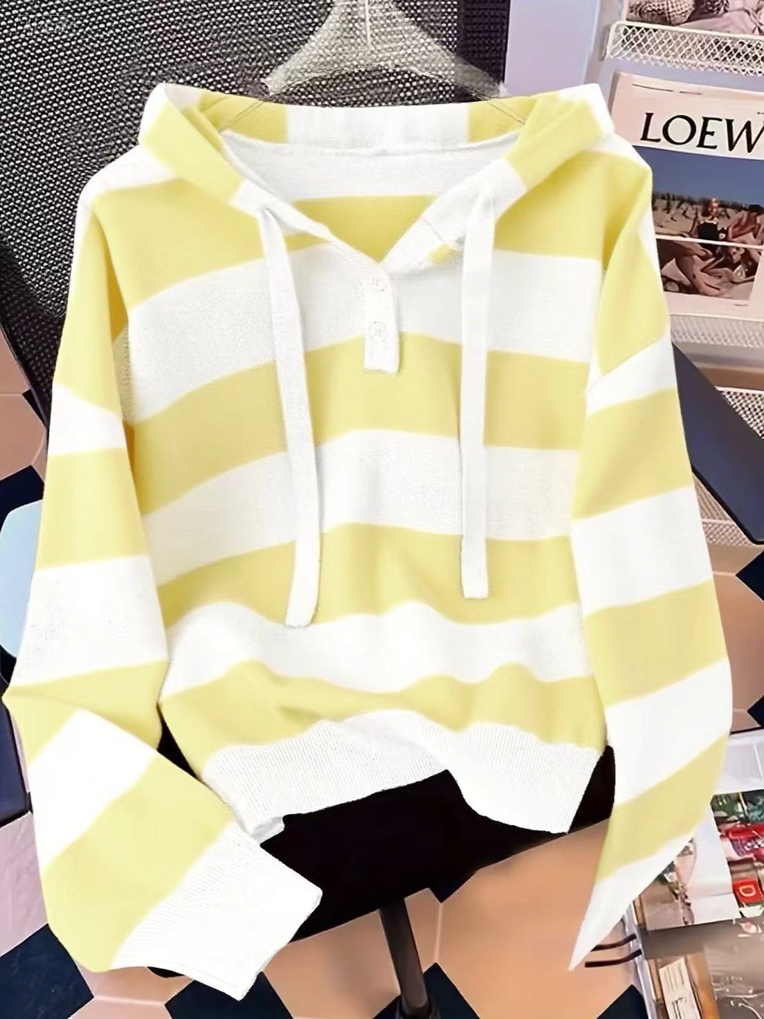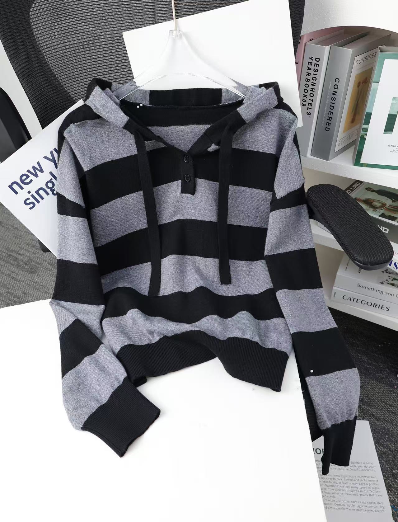 유럽판 크로스보더 여성 후드 풀오버 스웨터 2024 가을 겨울 신상 한국 스타일 루즈핏 스트라이프 니트웨어스토어 가기