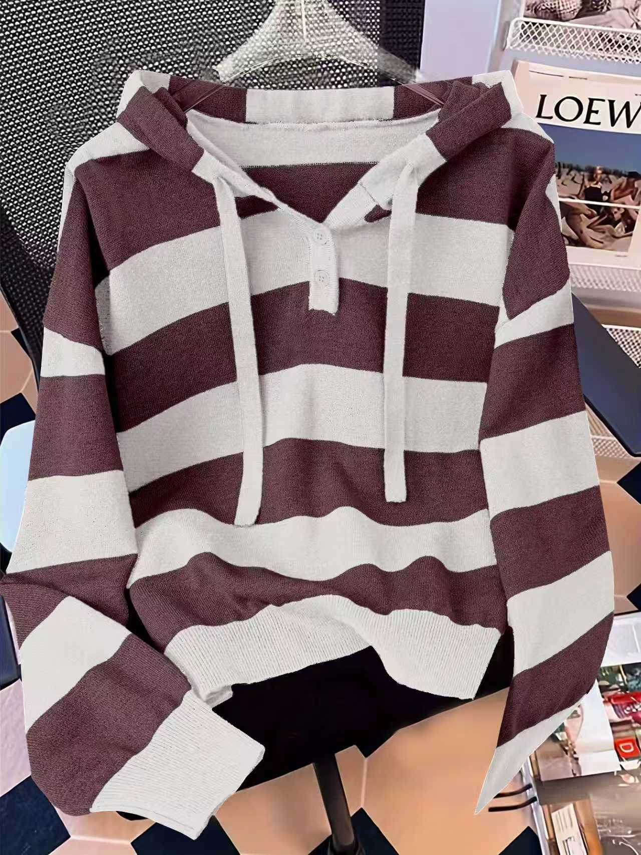 유럽판 크로스보더 여성 후드 풀오버 스웨터 2024 가을 겨울 신상 한국 스타일 루즈핏 스트라이프 니트웨어