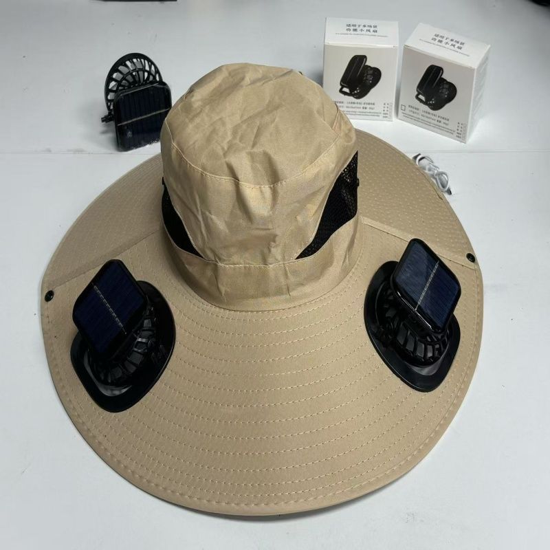 • 카키색 사각형 이중 어부 태양열 팬 모자