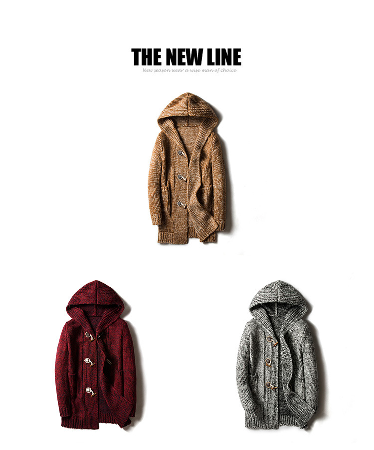 外贸男式中长款连帽开衫毛衣男 加厚毛衣牛角扣大码休闲外套