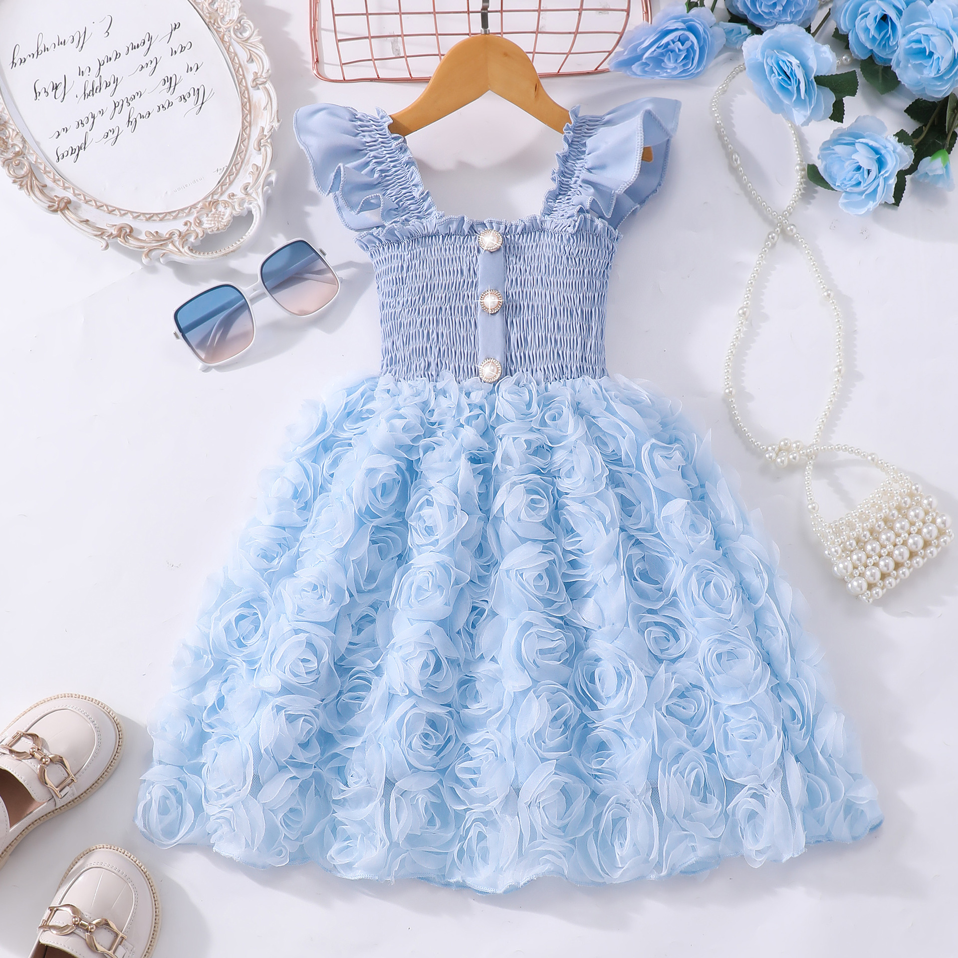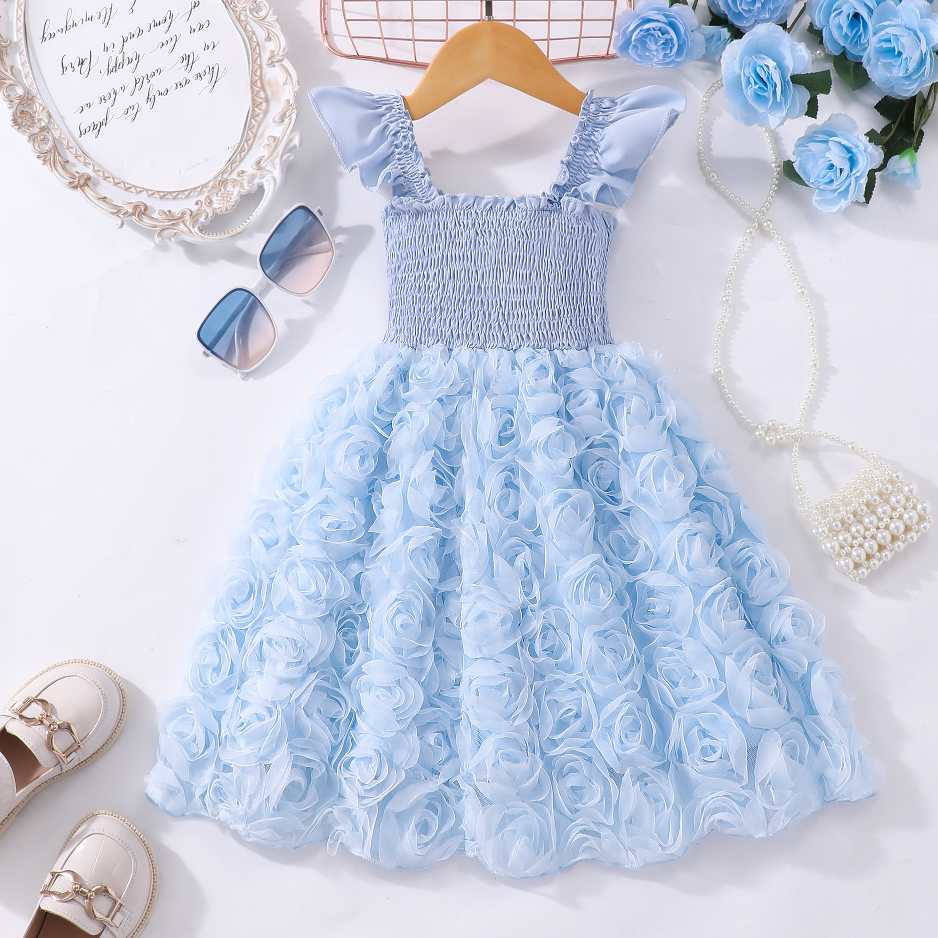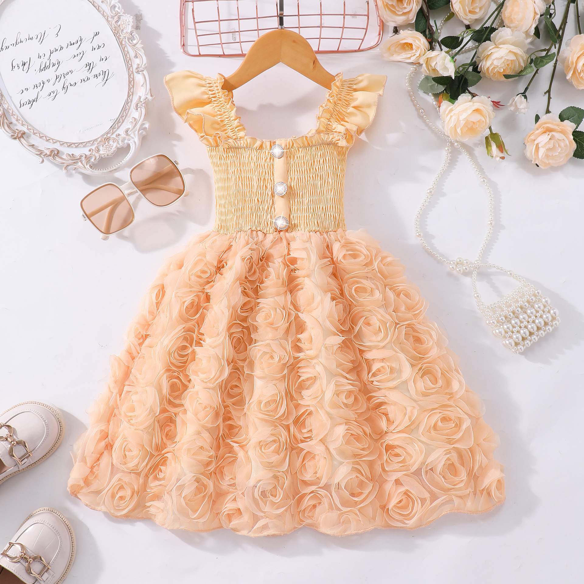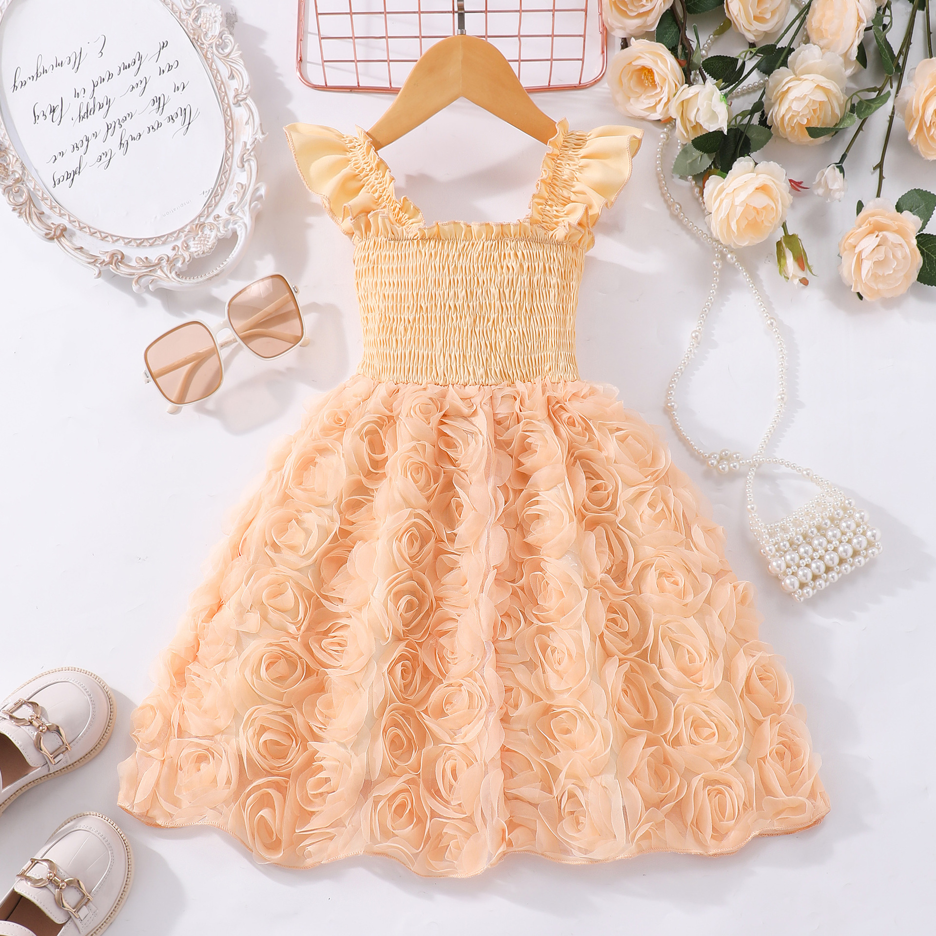 여아(소) 드레스, 여름 솔리드 컬러 플라잉 슬리브 입체 로즈 드레스스토어 가기