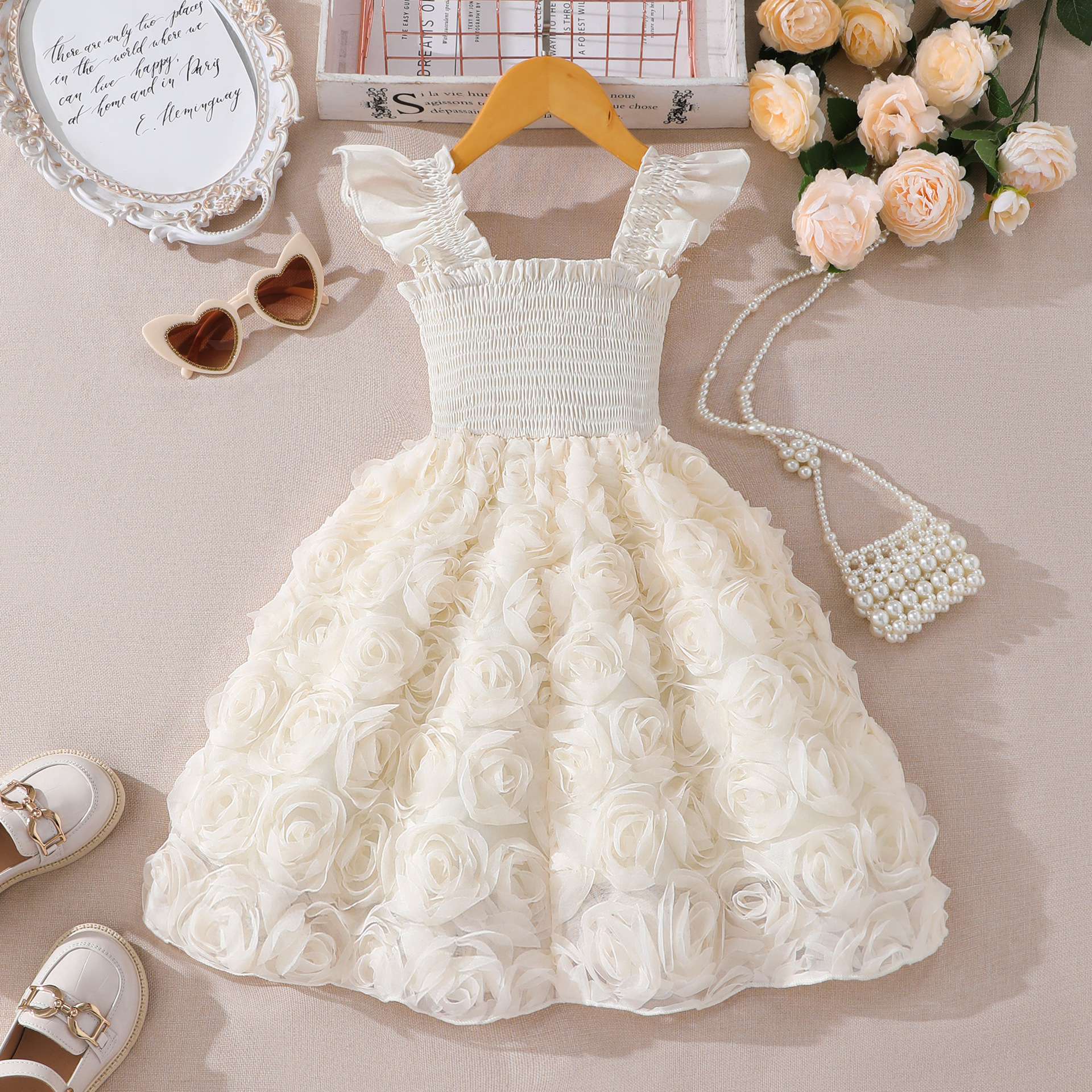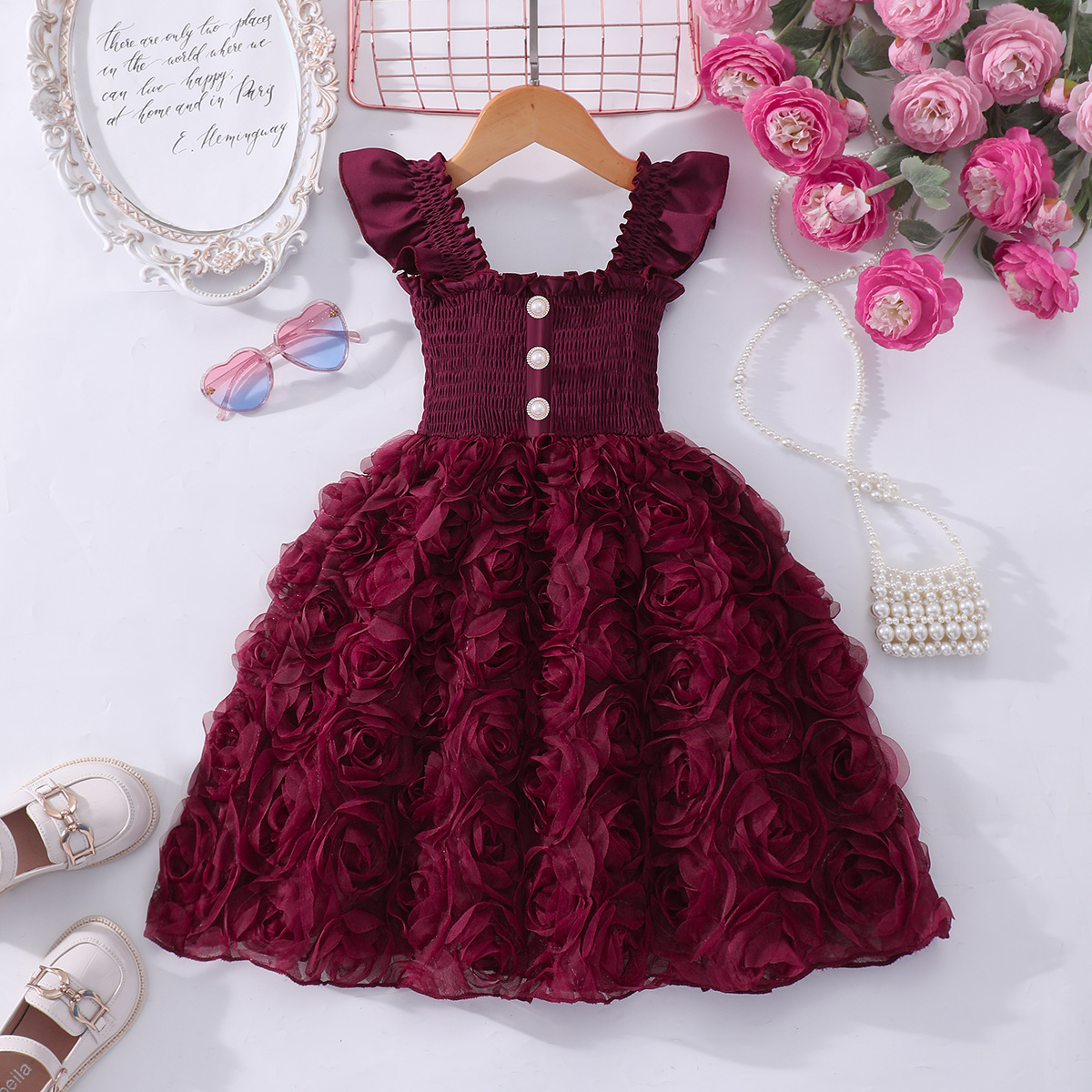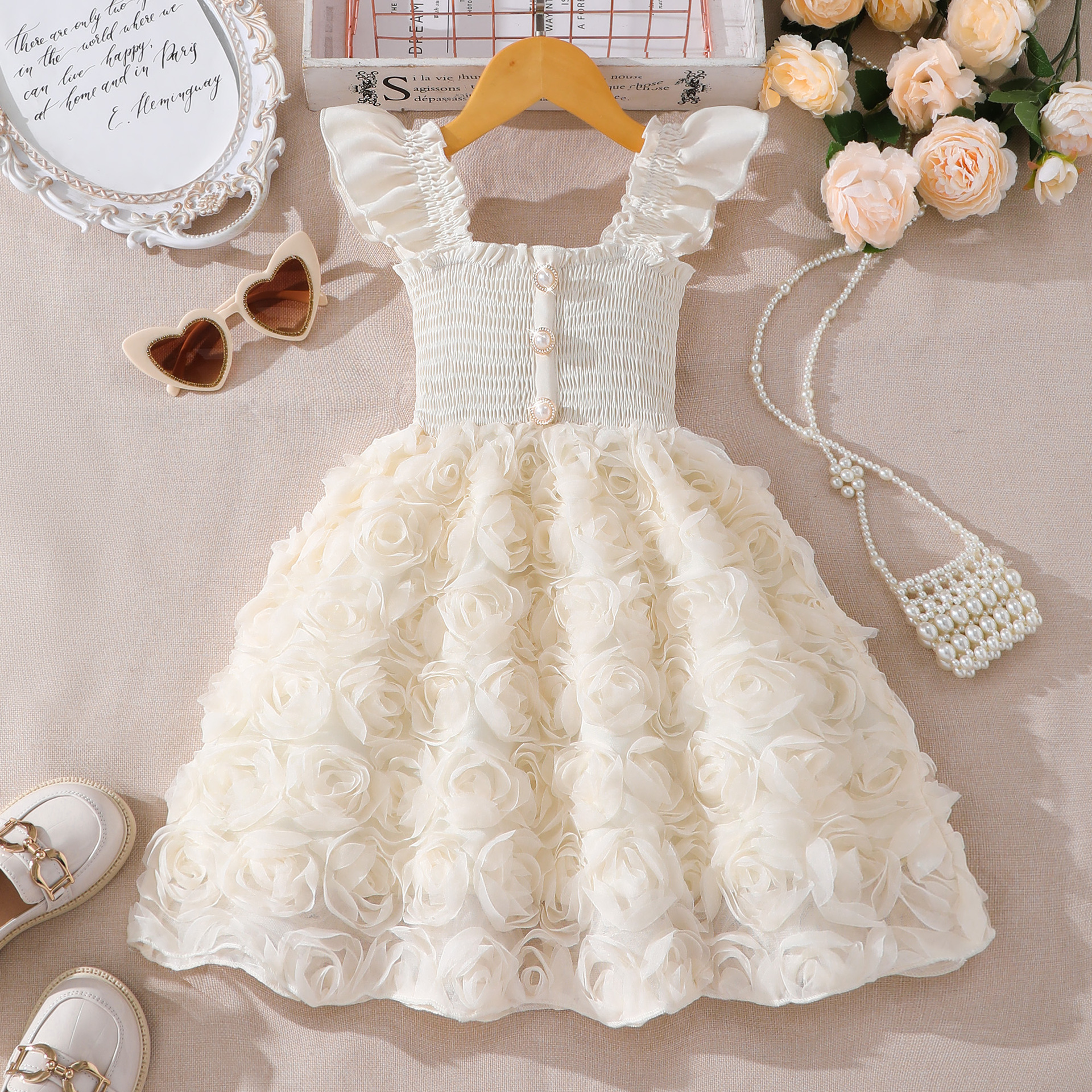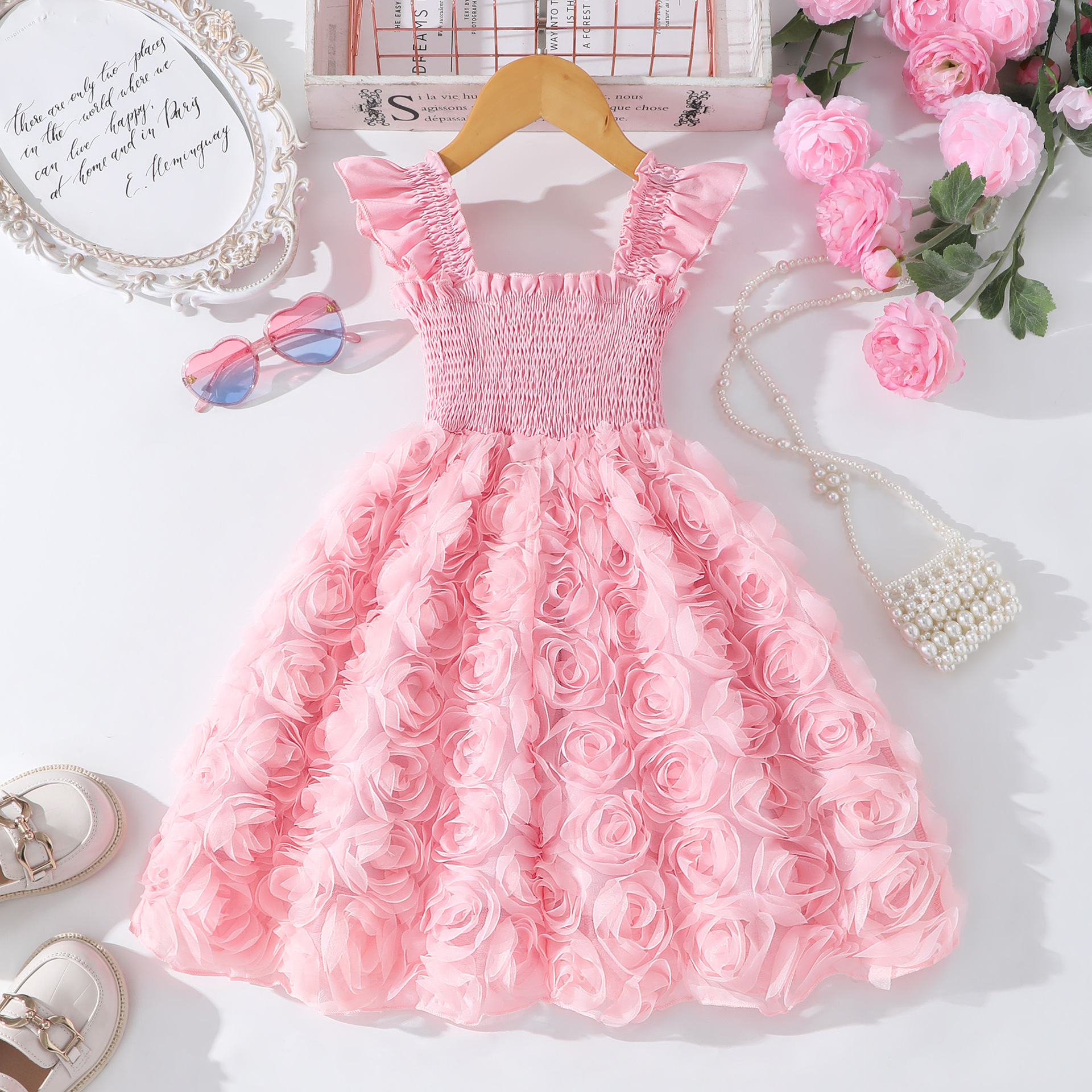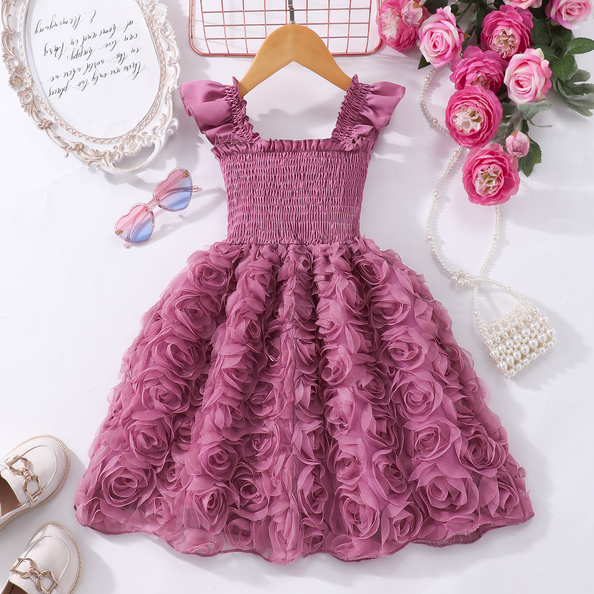 여아(소) 드레스, 여름 솔리드 컬러 플라잉 슬리브 입체 로즈 드레스
