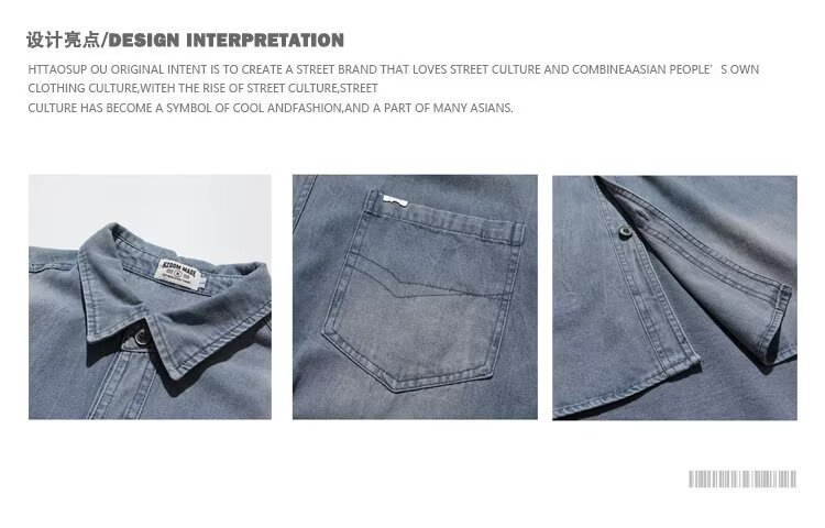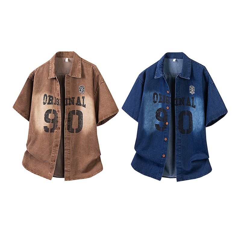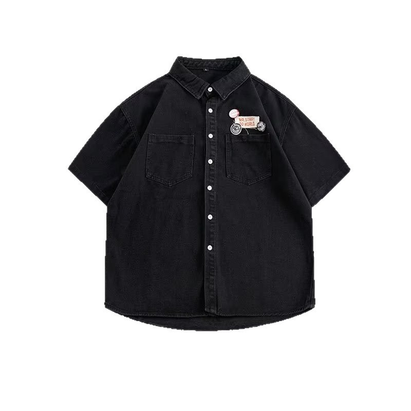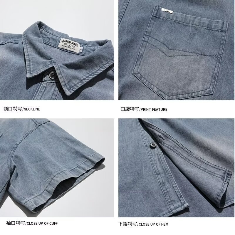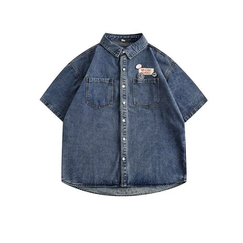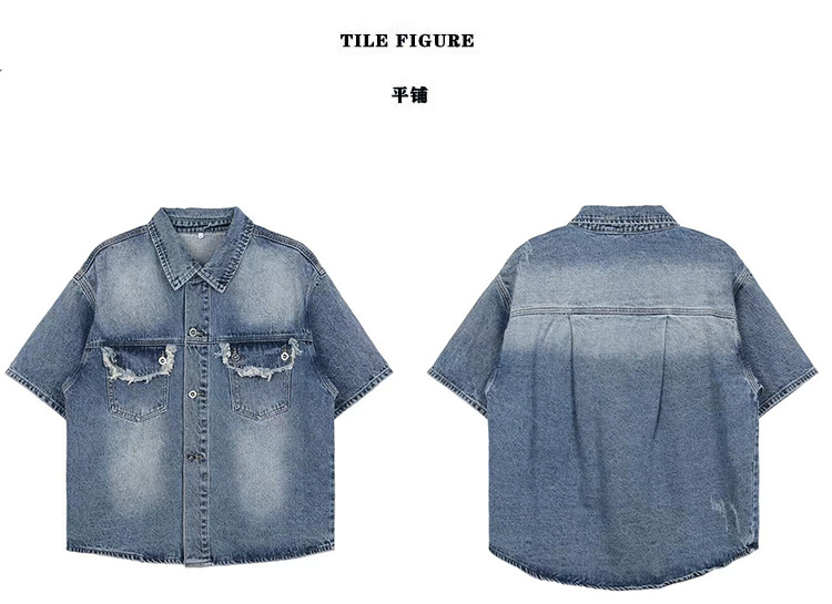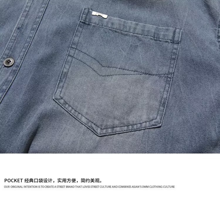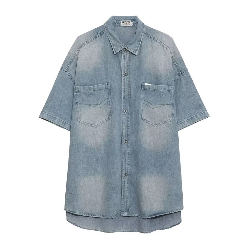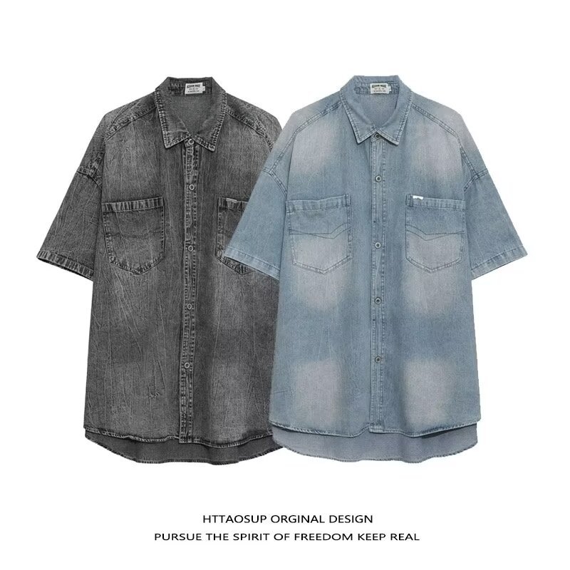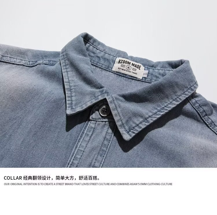 미국 스타일 빈티지 워싱 데님 반팔 셔츠 남성 디자인 루즈핏 캐주얼 셔츠 남녀공용스토어 가기