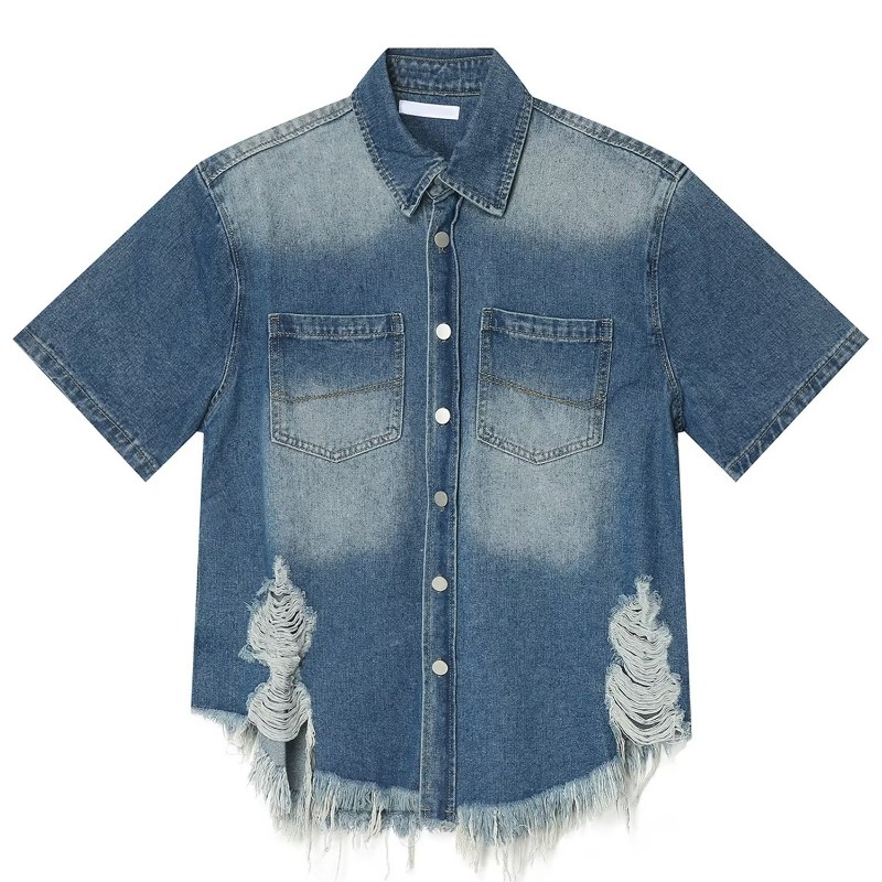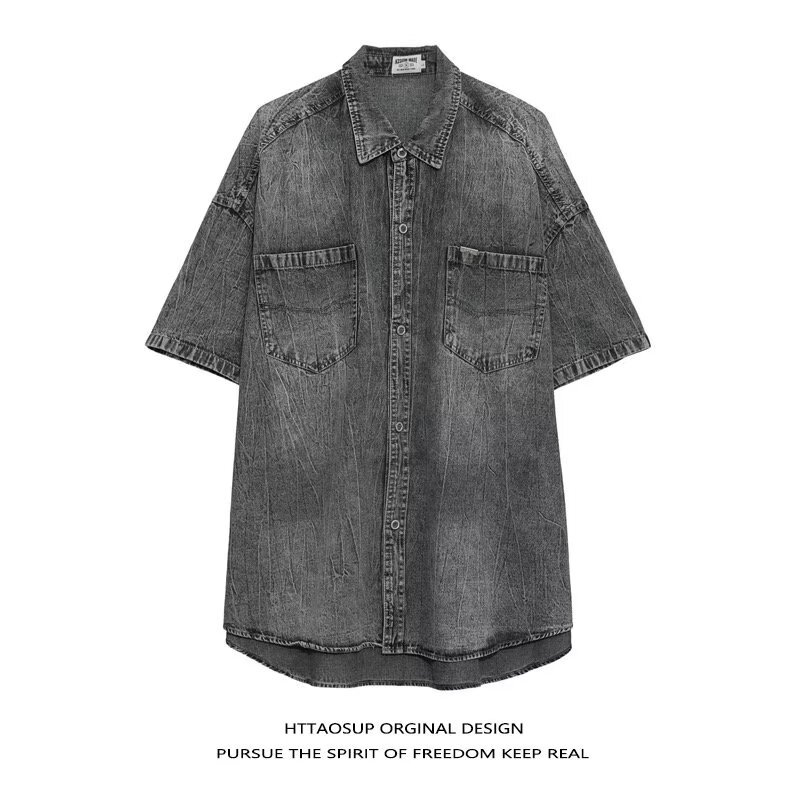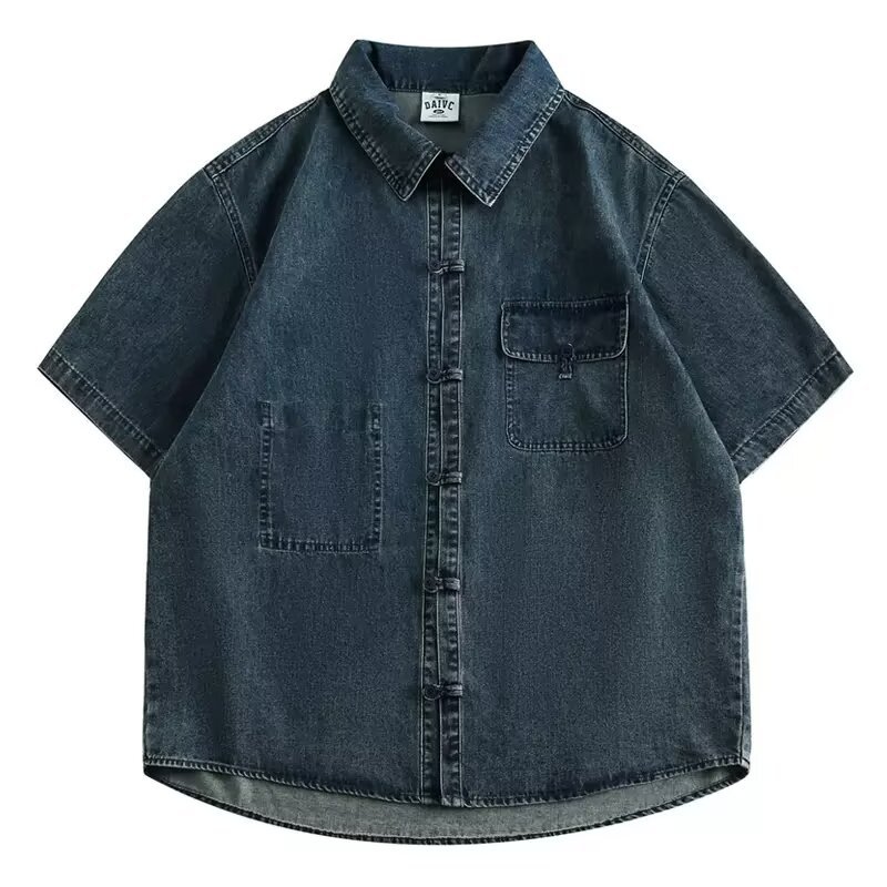 미국 스타일 빈티지 워싱 데님 반팔 셔츠 남성 디자인 루즈핏 캐주얼 셔츠 남녀공용