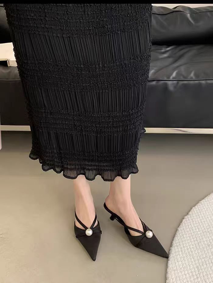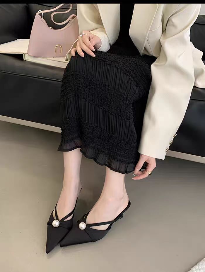 여성을위한 프랑스 새틴 진주 뾰족한 발가락 스틸레토 발가락 반 슬리퍼 2025 여름 새로운 다목적 기질 외부 샌들