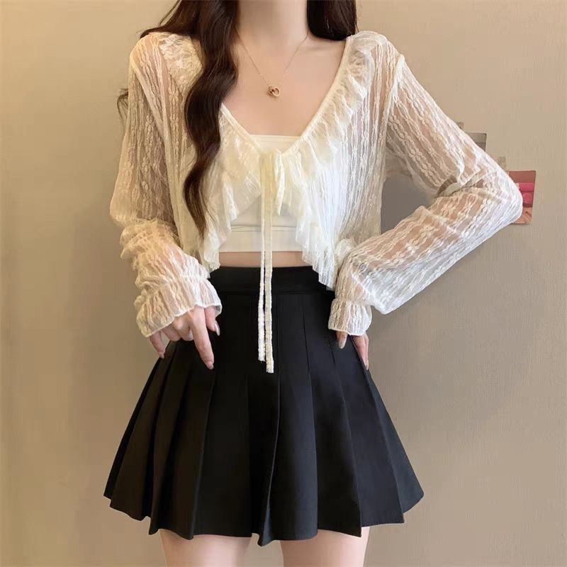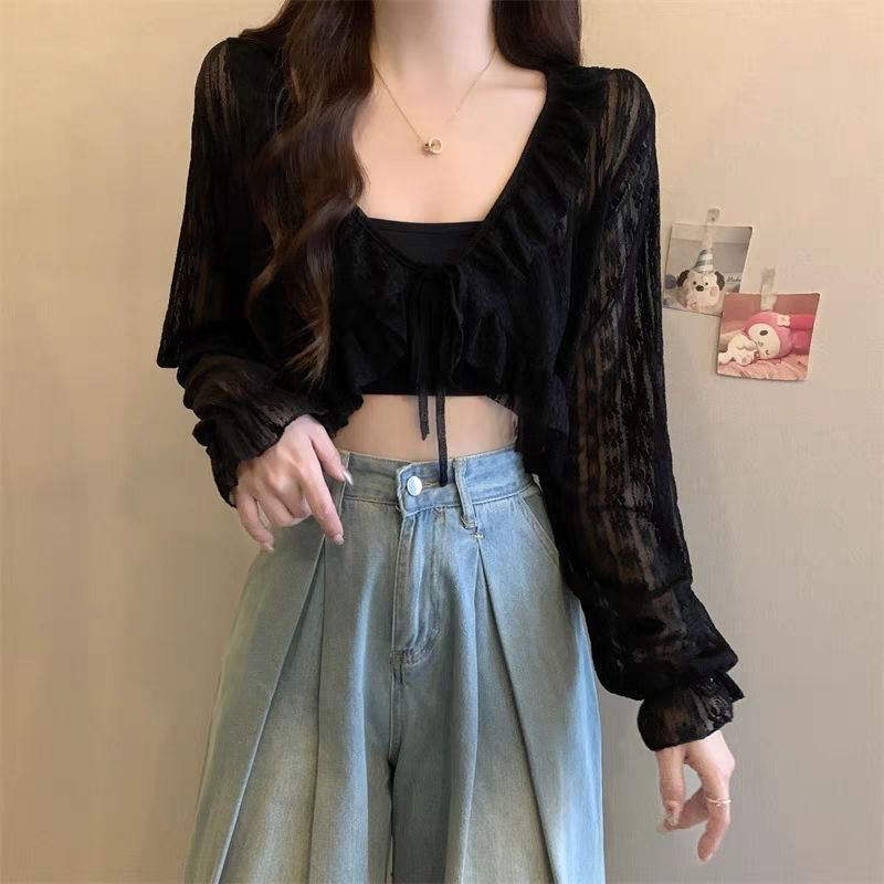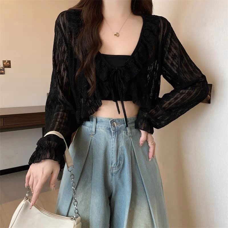 긴팔 레이스업 쉬폰 셔츠, 레이스 여름 가디건 탑, 신상 짧은 얇은 숄 조끼 자외선 차단 재킷
