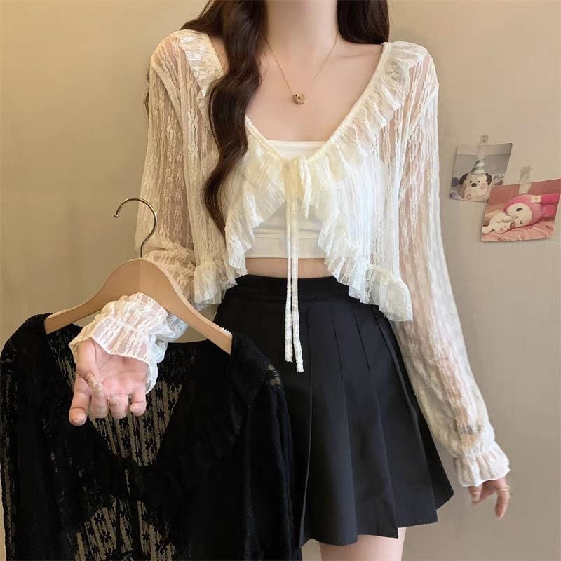 긴팔 레이스업 쉬폰 셔츠, 레이스 여름 가디건 탑, 신상 짧은 얇은 숄 조끼 자외선 차단 재킷스토어 가기