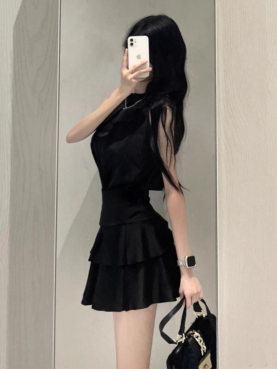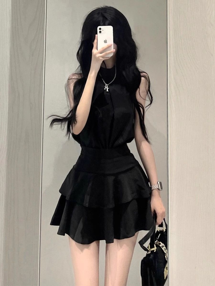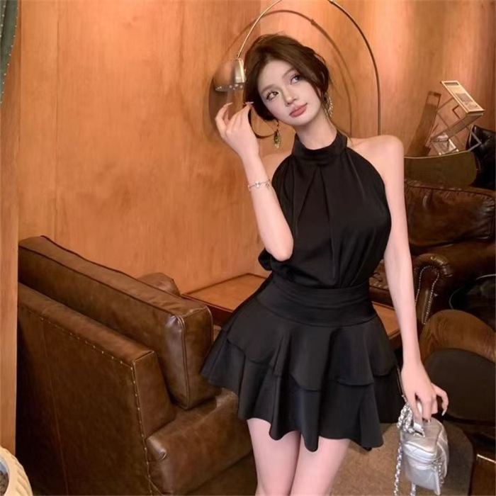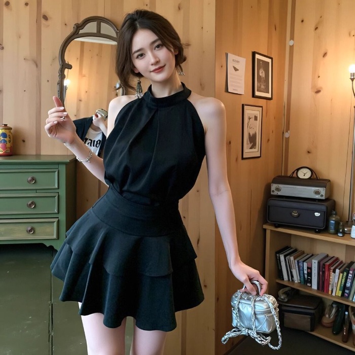 여성용 섹시한 작은 향기 스타일 정장 스커트, 여름 작은 드레스, 작은 검은색 드레스, 민소매 홀터넥 서스펜더 스커트 투피스 세트