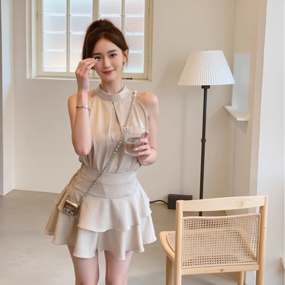여성용 섹시한 작은 향기 스타일 정장 스커트, 여름 작은 드레스, 작은 검은색 드레스, 민소매 홀터넥 서스펜더 스커트 투피스 세트스토어 가기