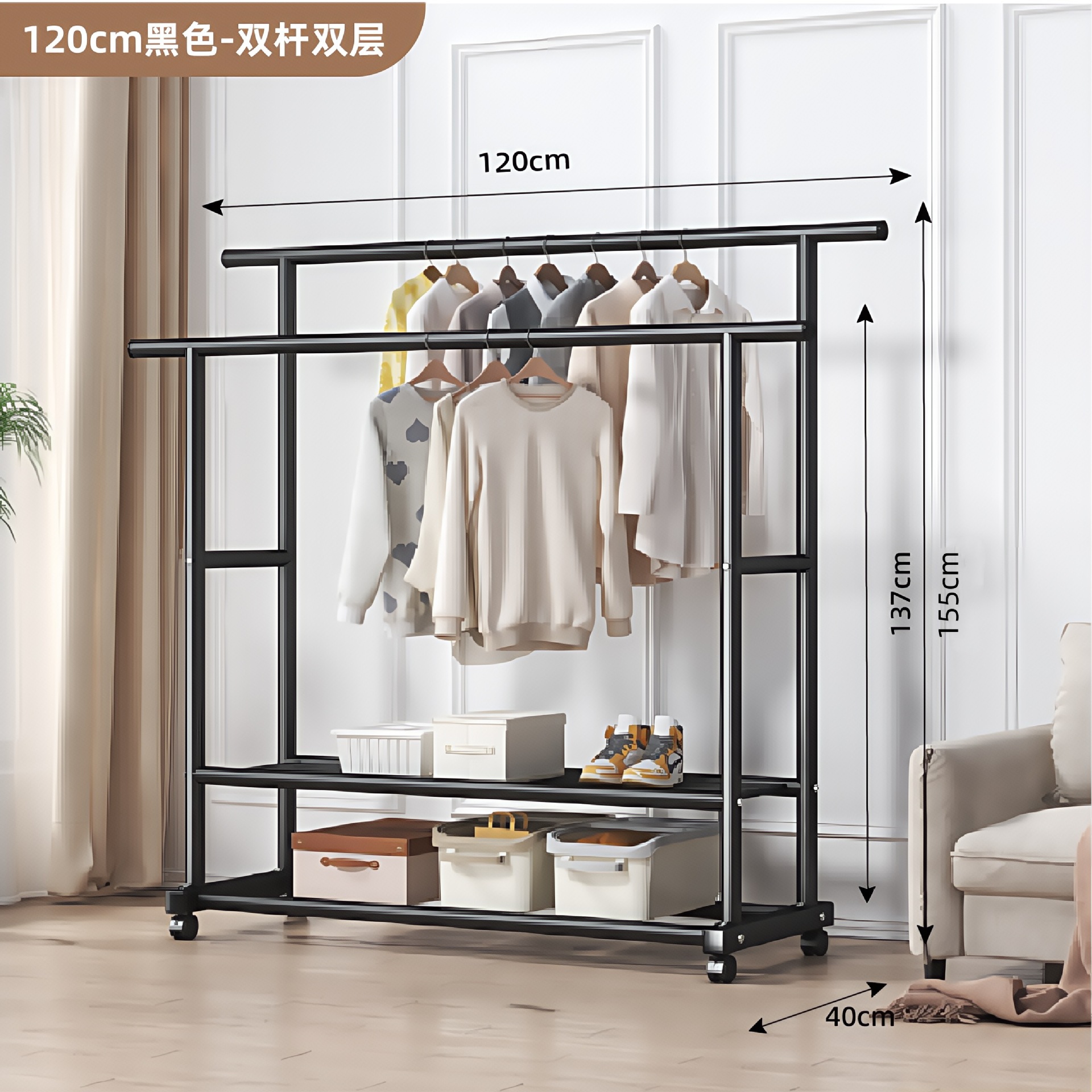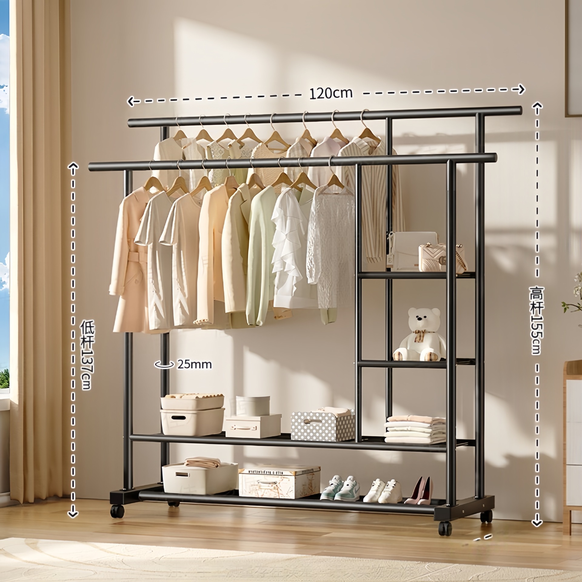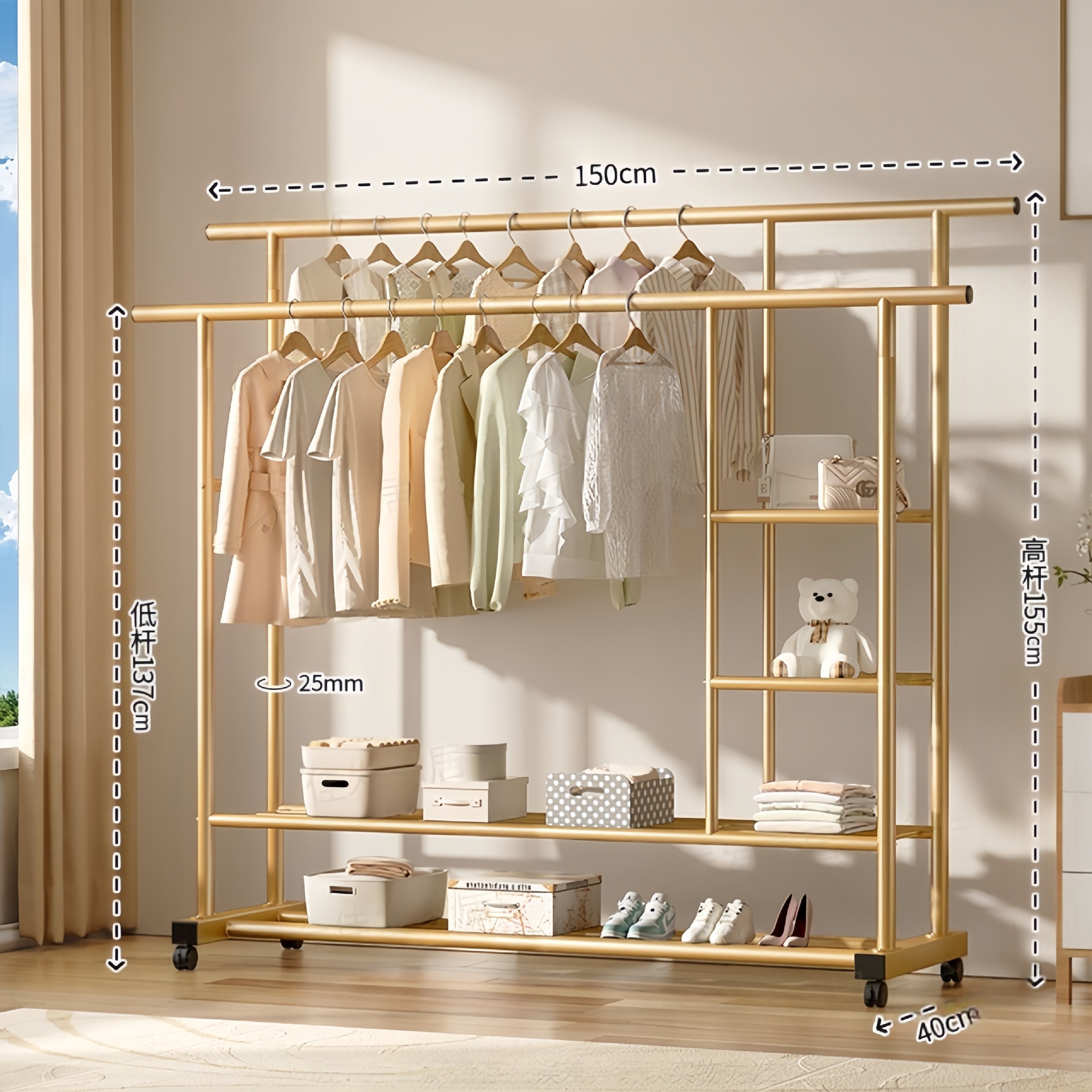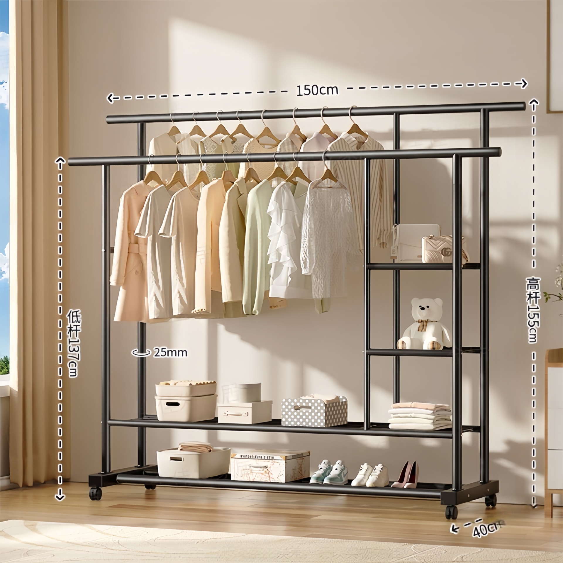 두꺼운 이중 막대 이동식 기숙사 옷걸이, 두꺼운 옷걸이, 바닥에서 천장까지 올려진 수직 가정용 침실 발코니 옷걸이, 간단함스토어 가기