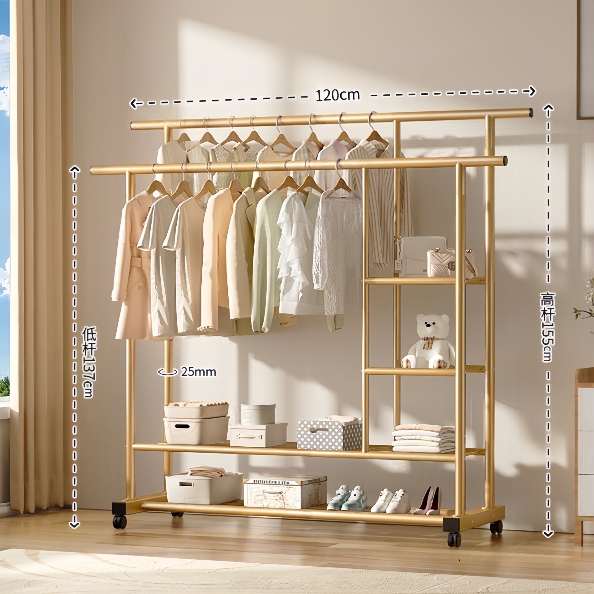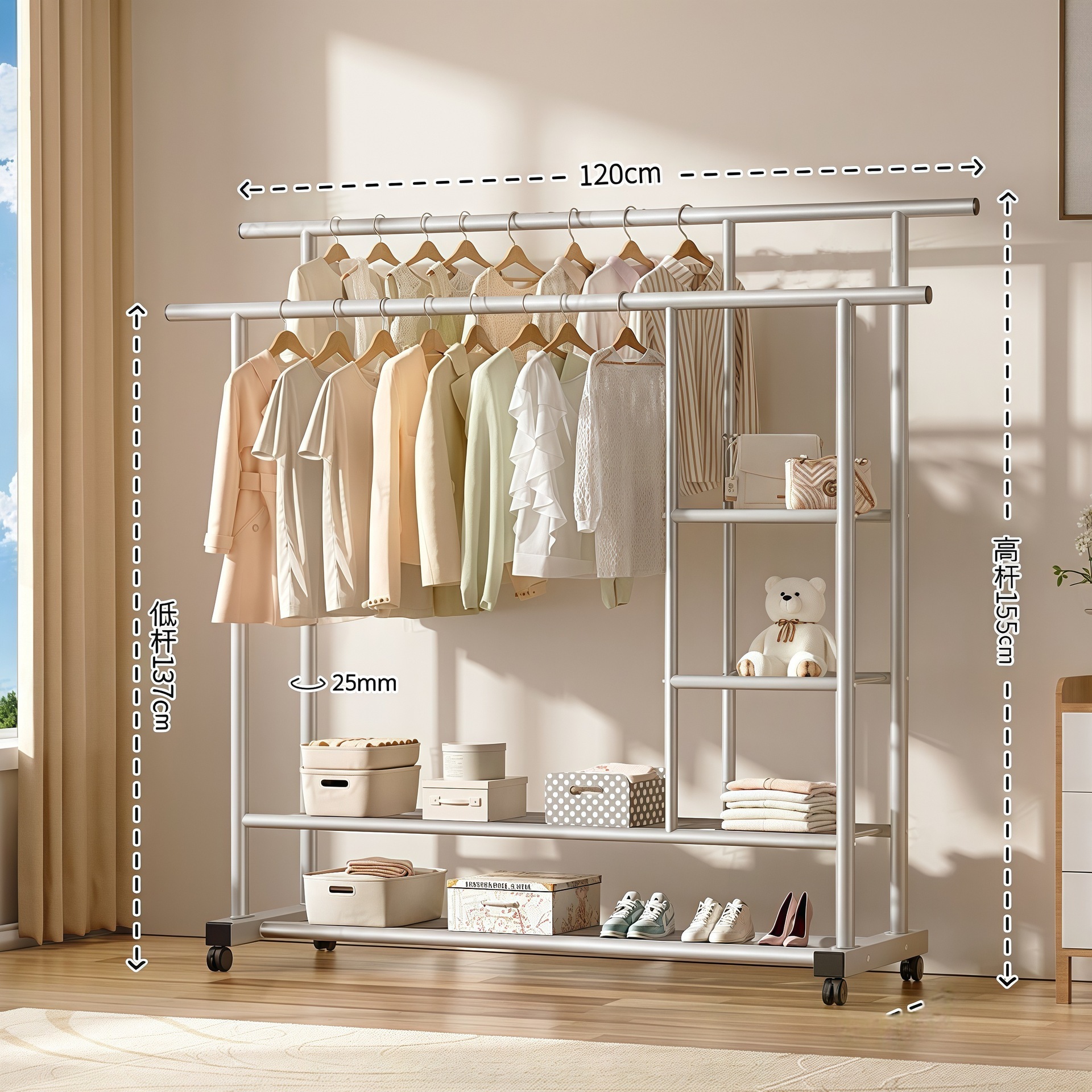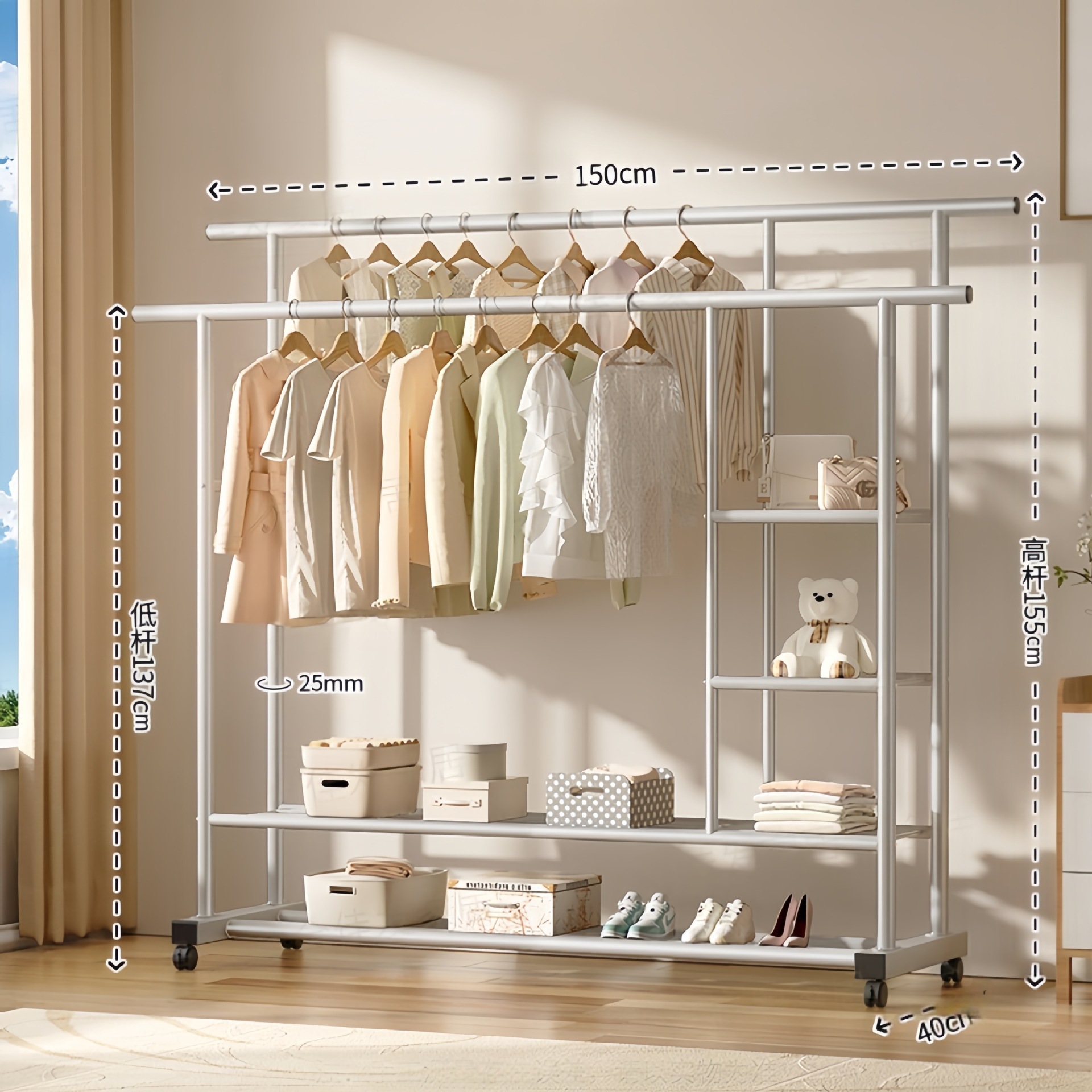 두꺼운 이중 막대 이동식 기숙사 옷걸이, 두꺼운 옷걸이, 바닥에서 천장까지 올려진 수직 가정용 침실 발코니 옷걸이, 간단함