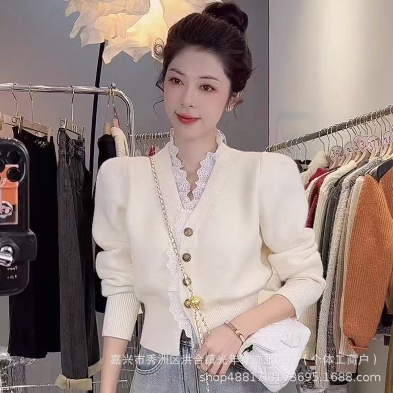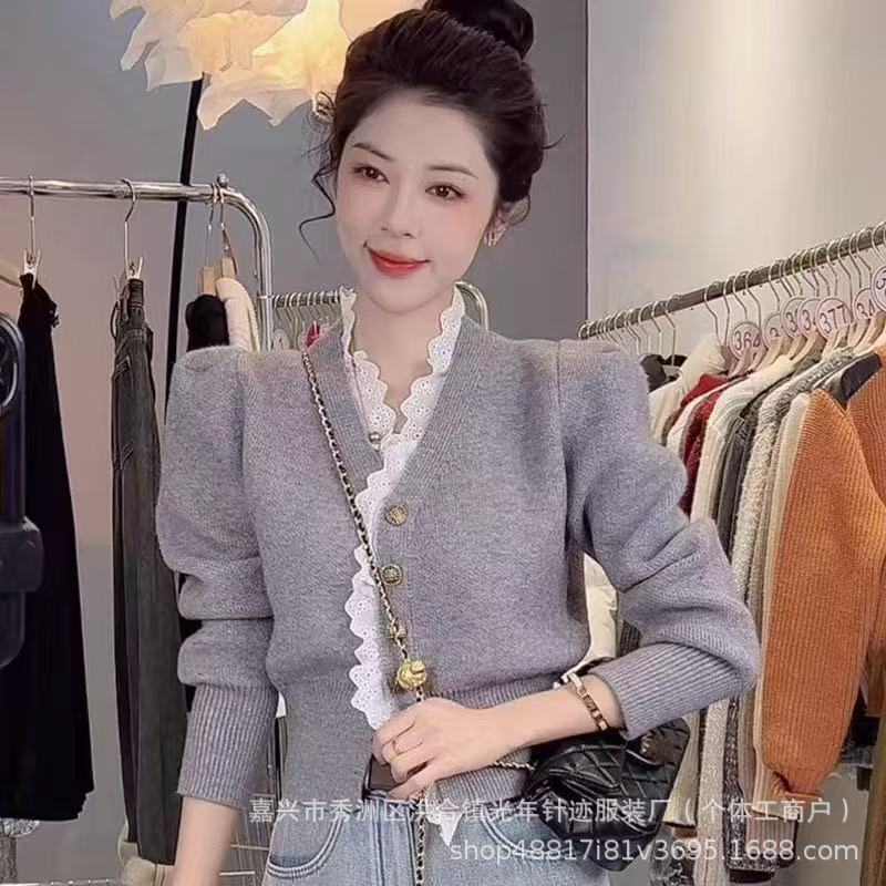 프렌치 니치 시크 v 넥 스플 라이스 레이스 긴팔 스웨터 여성 가을, 겨울 신작 짧은 니트 카디건 탑