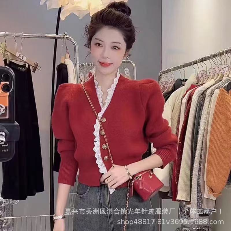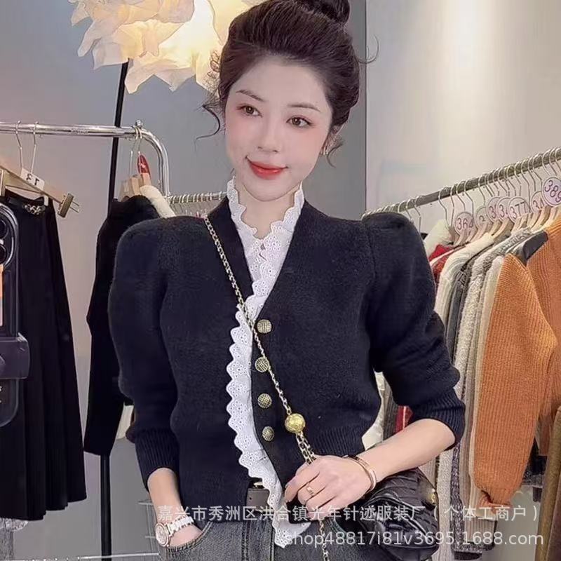 프렌치 니치 시크 v 넥 스플 라이스 레이스 긴팔 스웨터 여성 가을, 겨울 신작 짧은 니트 카디건 탑스토어 가기
