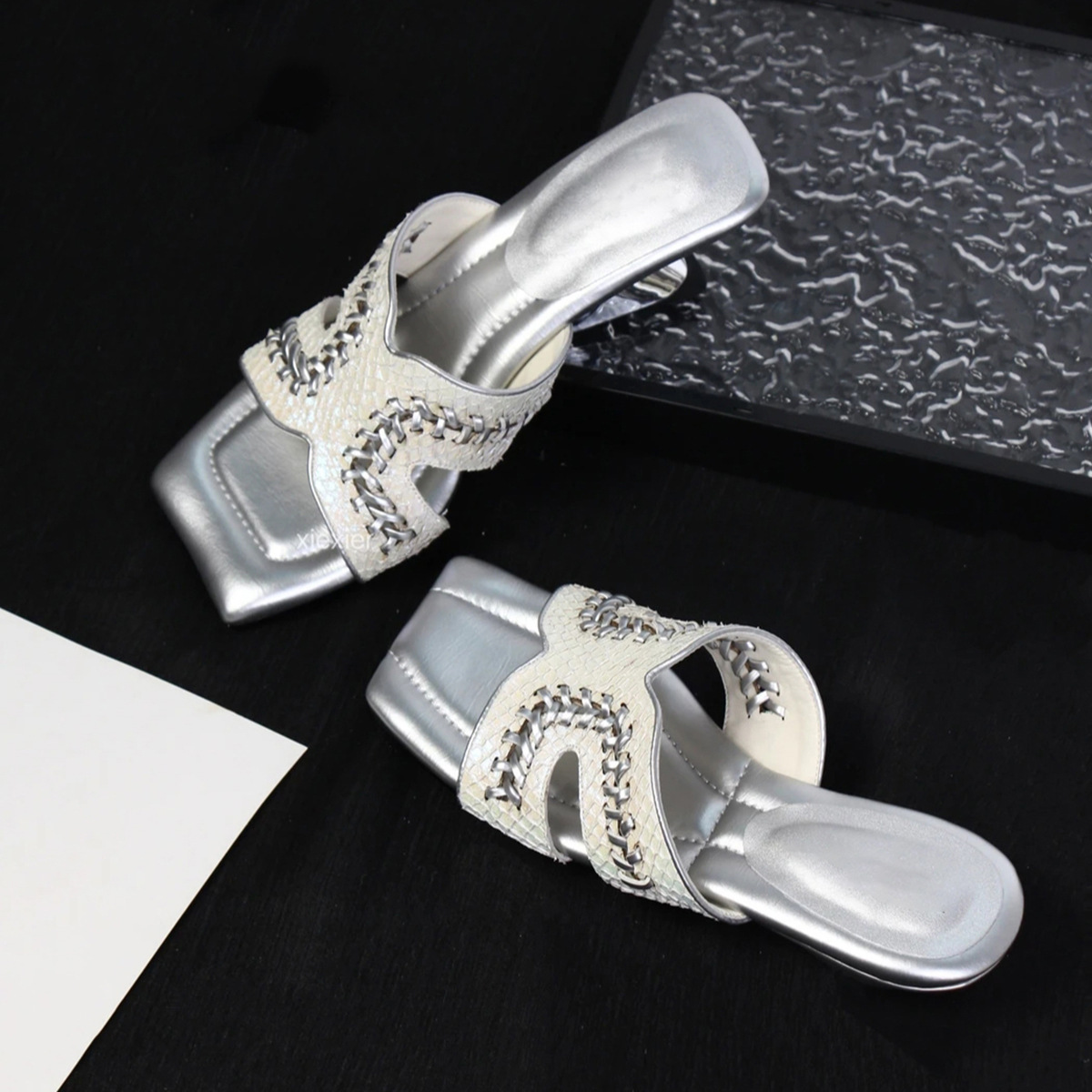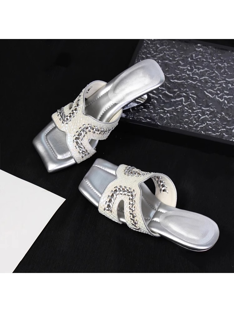 여성을 위한 패셔너블한 니치 스퀘어 토 디자인 우븐 슬리퍼 2025 새로운 프렌치 스타일 아우터 캐주얼 슬리퍼