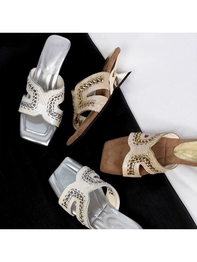여성을 위한 패셔너블한 니치 스퀘어 토 디자인 우븐 슬리퍼 2025 새로운 프렌치 스타일 아우터 캐주얼 슬리퍼스토어 가기