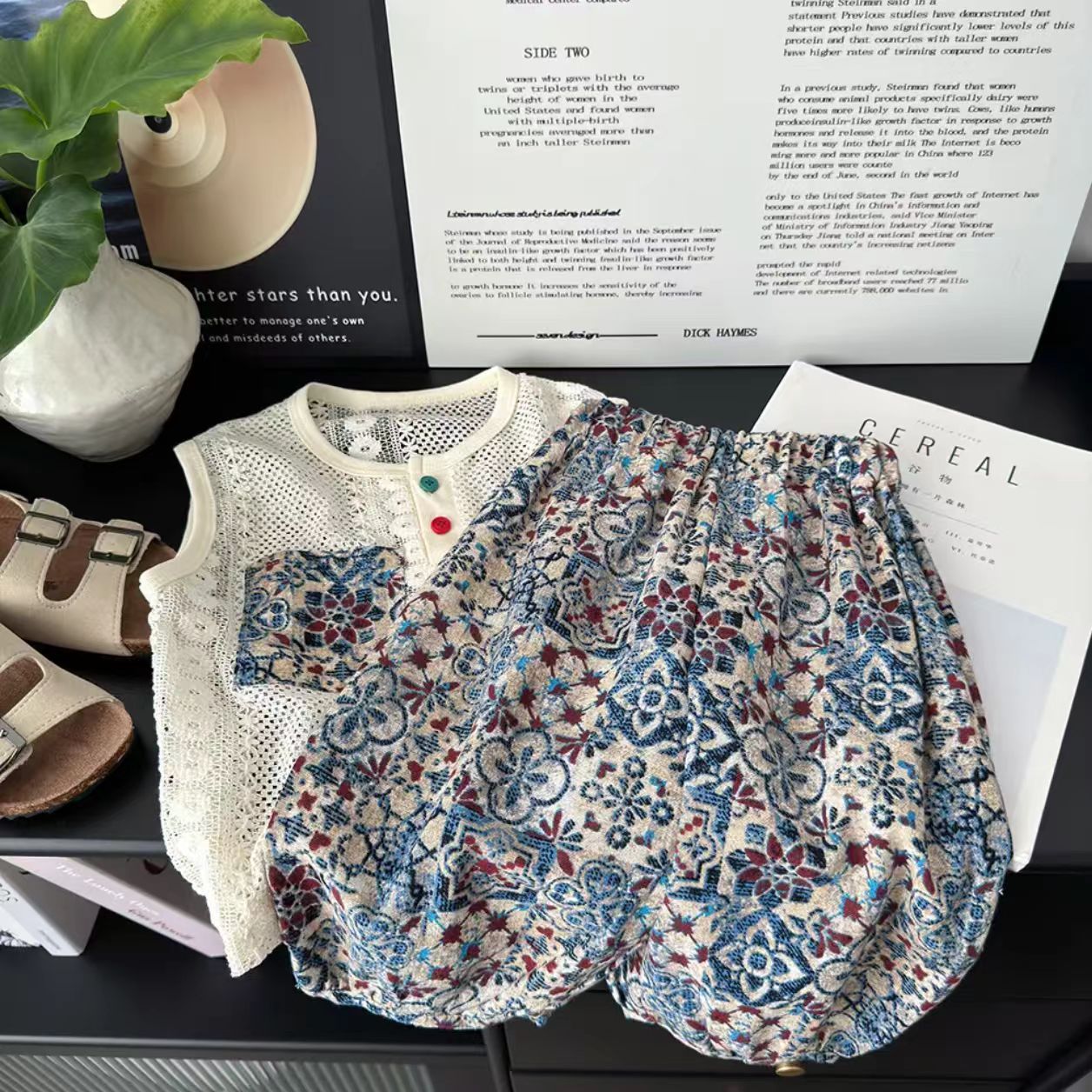 남아 민족풍 세트 2025 여름 니트 크로셰 스티치 폴로 셔츠 투피스 세트 트렌디한 아동용 레이스 디자인