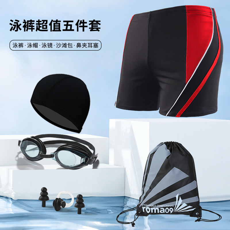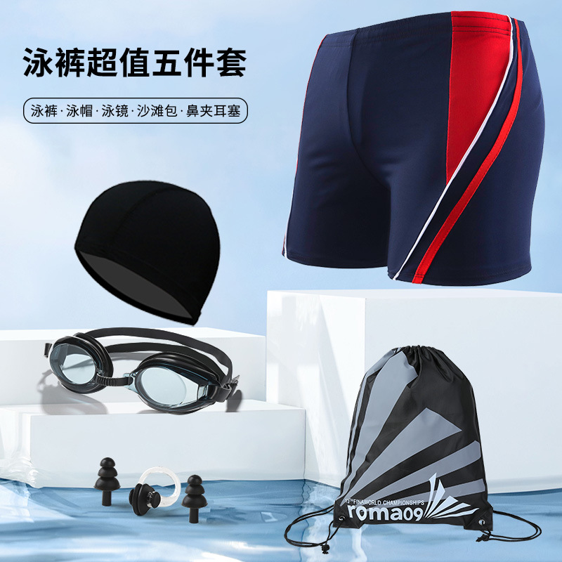 • 파란색 바탕에 빨간색 [수영 트렁크 + 수영 모자 + 수영 고글 + 코 클립 귀마개 + 비치 백]