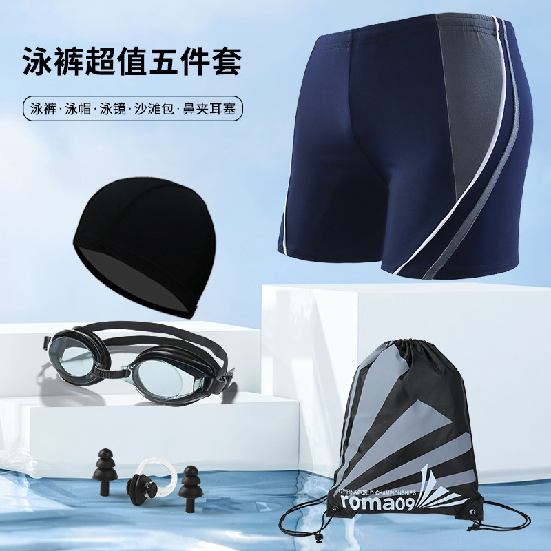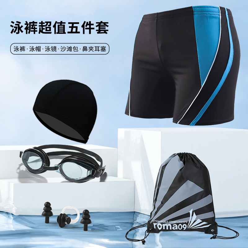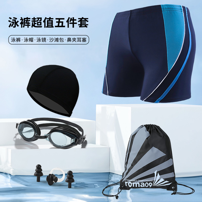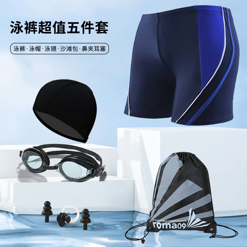 • 파란색 배경에 진한 파란색 [수영 트렁크 + 수영 모자 + 수영 고글 + 코 클립 귀마개 + 비치 백]
