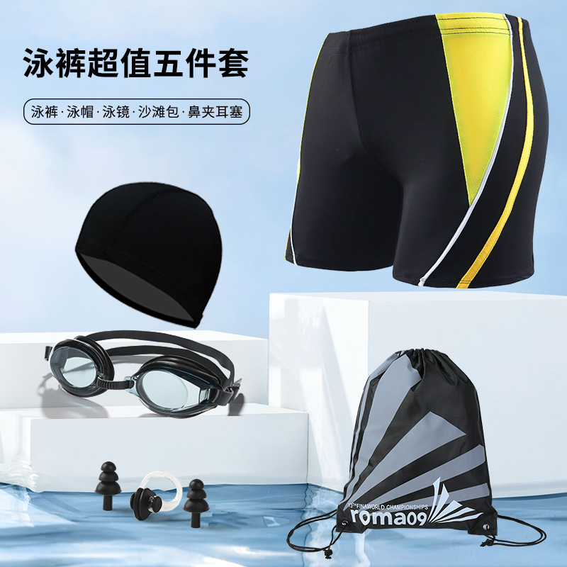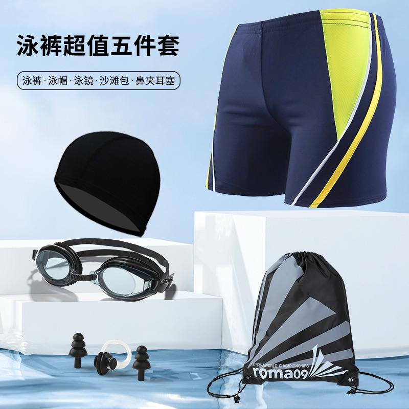 • 파란색 바탕에 노란색 [수영 트렁크 + 수영 모자 + 수영 고글 + 코 클립 귀마개 + 비치 백]