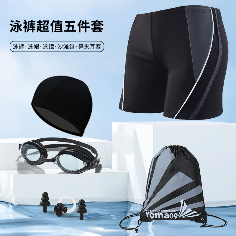 • 검정색 바탕에 회색 [수영팬츠 + 수영모 + 수영고글 + 코클립 귀마개 + 비치백]