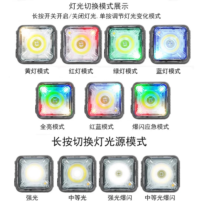 2-灯光模式:1-强白光 /2-中白光 /3-强闪光白光 /4-强闪光中白光 /5-黄光 /6-红光 /7-绿光 /8-蓝光 / 黄红绿蓝灯模式 / 红蓝闪烁 / 黄红绿蓝爆闪模式
