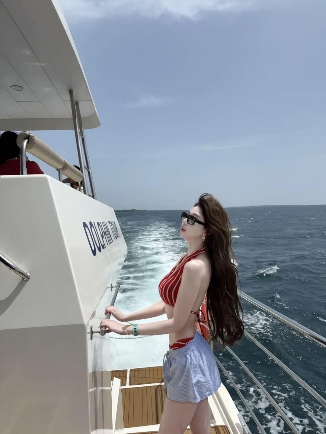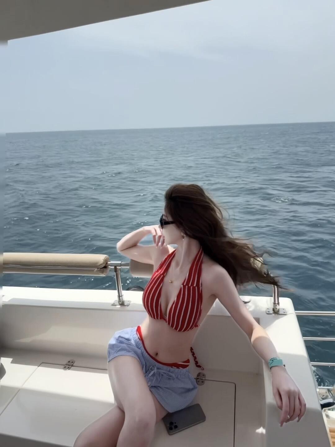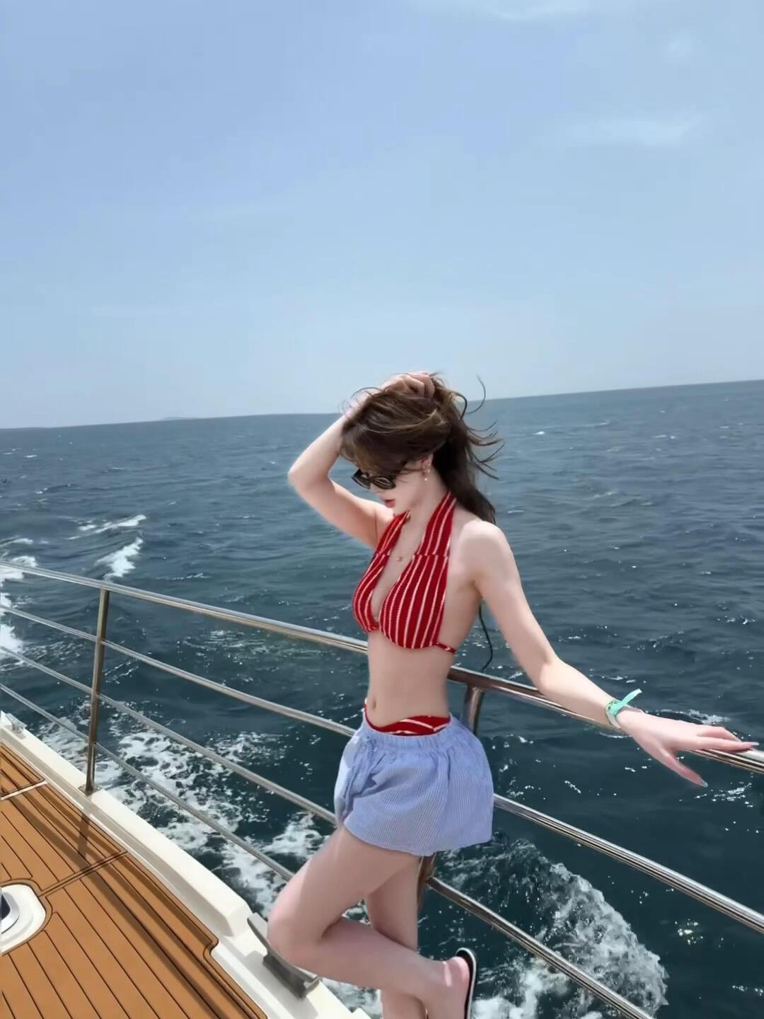 • 빨간 줄무늬 비키니 + 파란색 비치 반바지