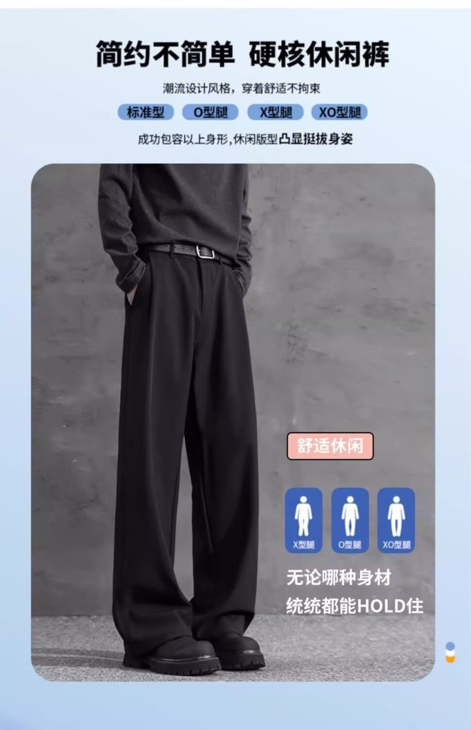 드레이프한 느낌의 남아용 블랙 스트레이트 루즈 팬츠, 여름 아이스 실크 캐주얼 팬츠, 아메리칸 하이웨이스트 수트 팬츠스토어 가기