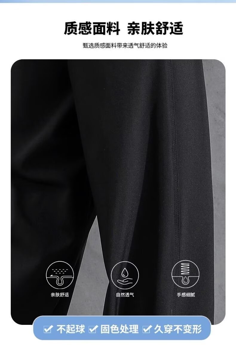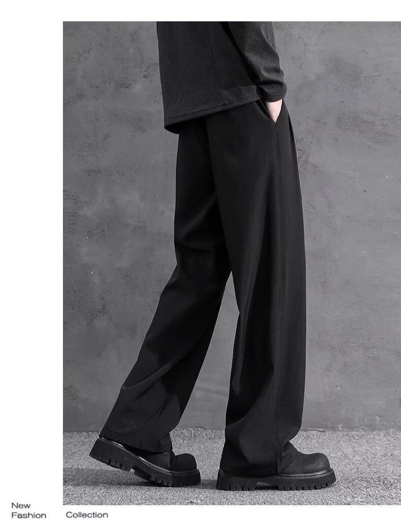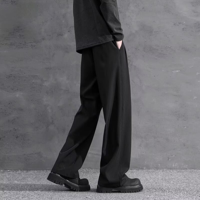 드레이프한 느낌의 남아용 블랙 스트레이트 루즈 팬츠, 여름 아이스 실크 캐주얼 팬츠, 아메리칸 하이웨이스트 수트 팬츠