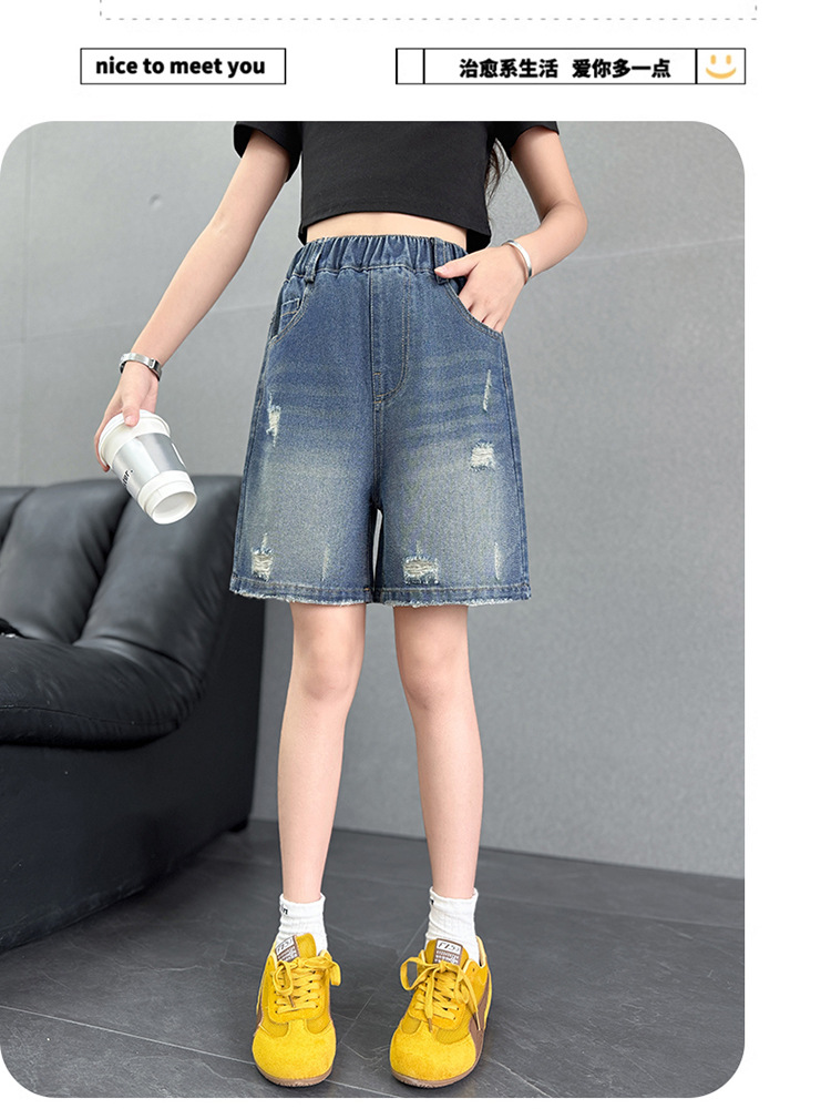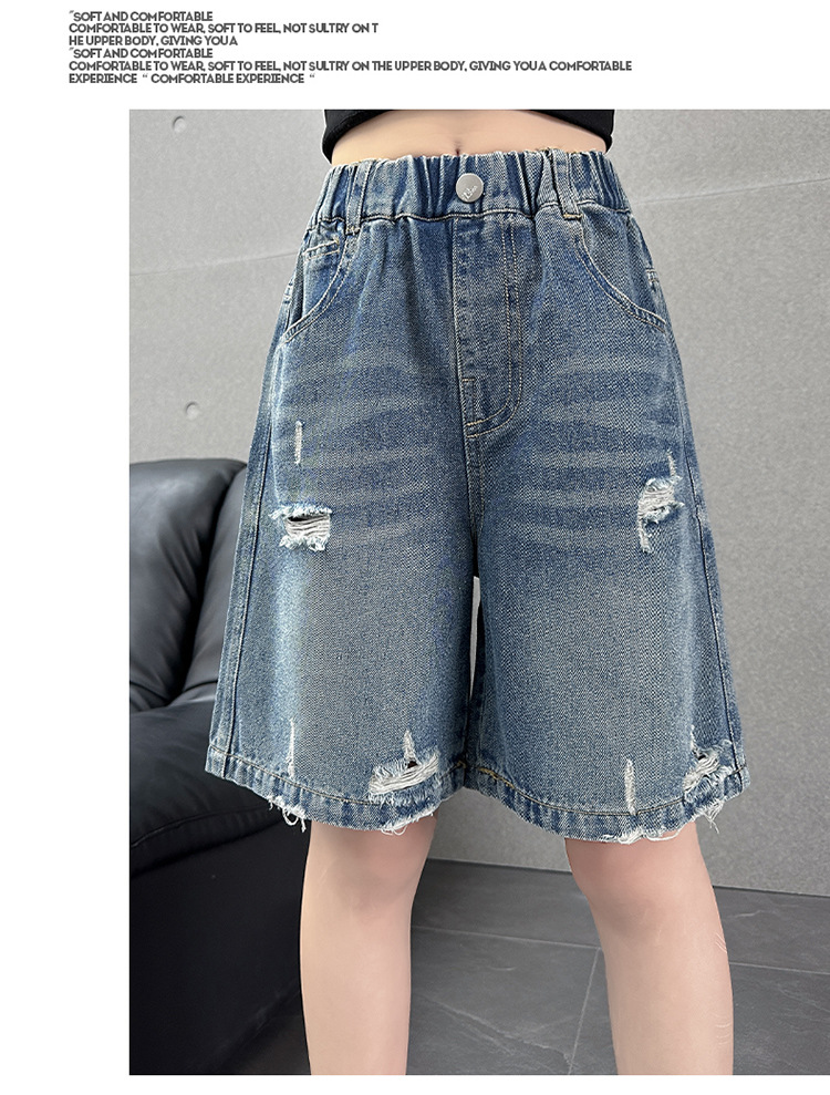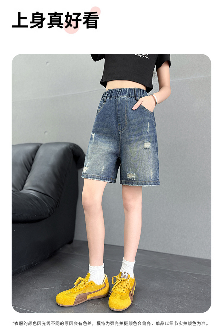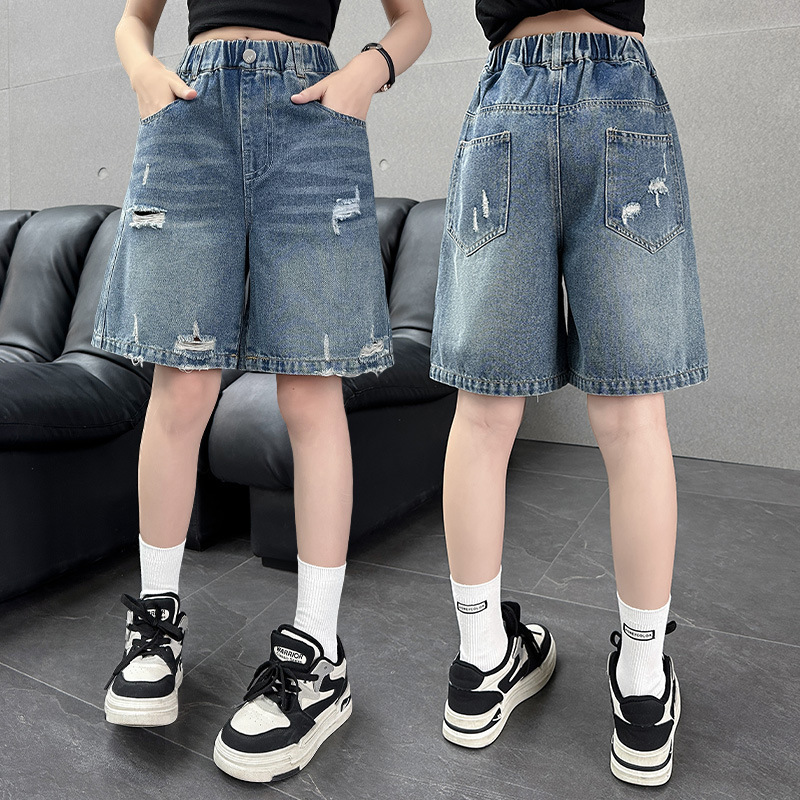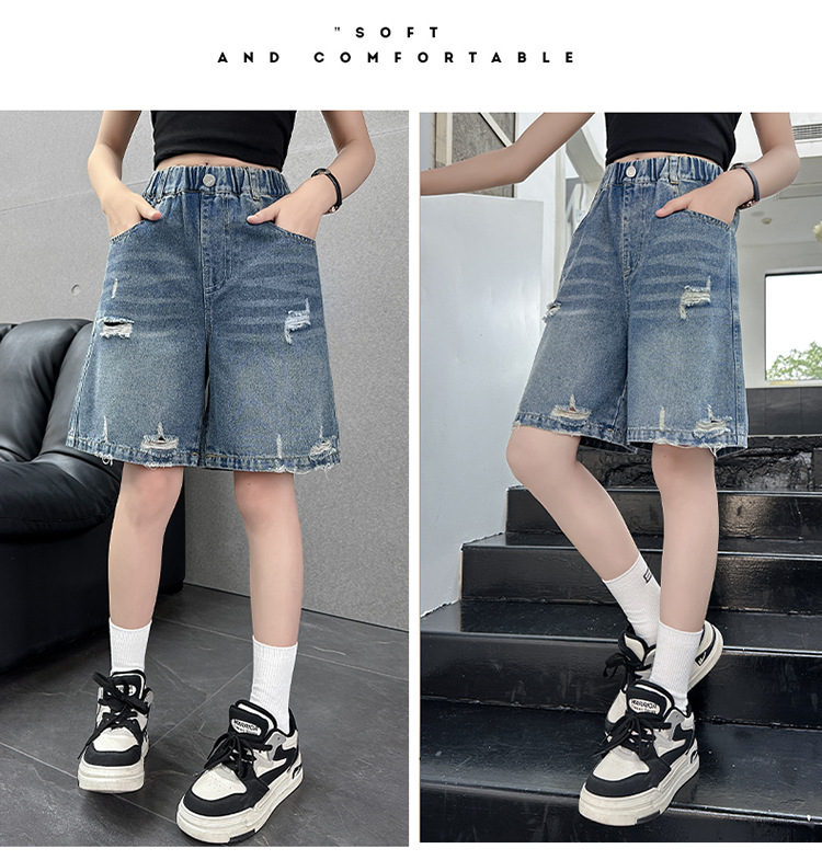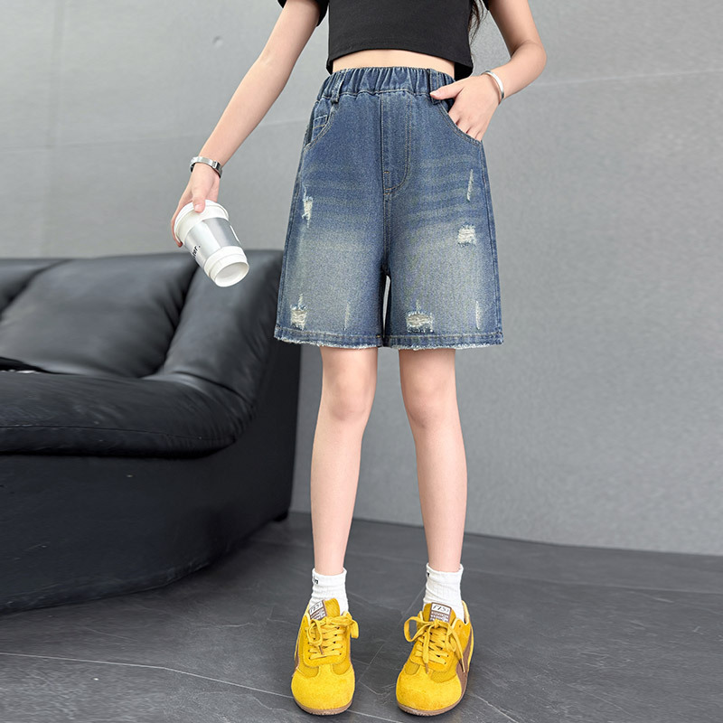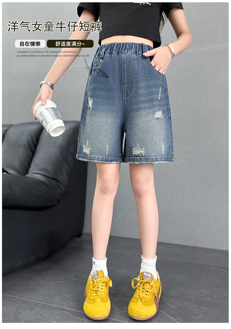 여아 데님 반바지 여름용 얇은 스타일 중대형 아동용 2026년 신상 레트로 아동복 세련된 데미지 팬츠
