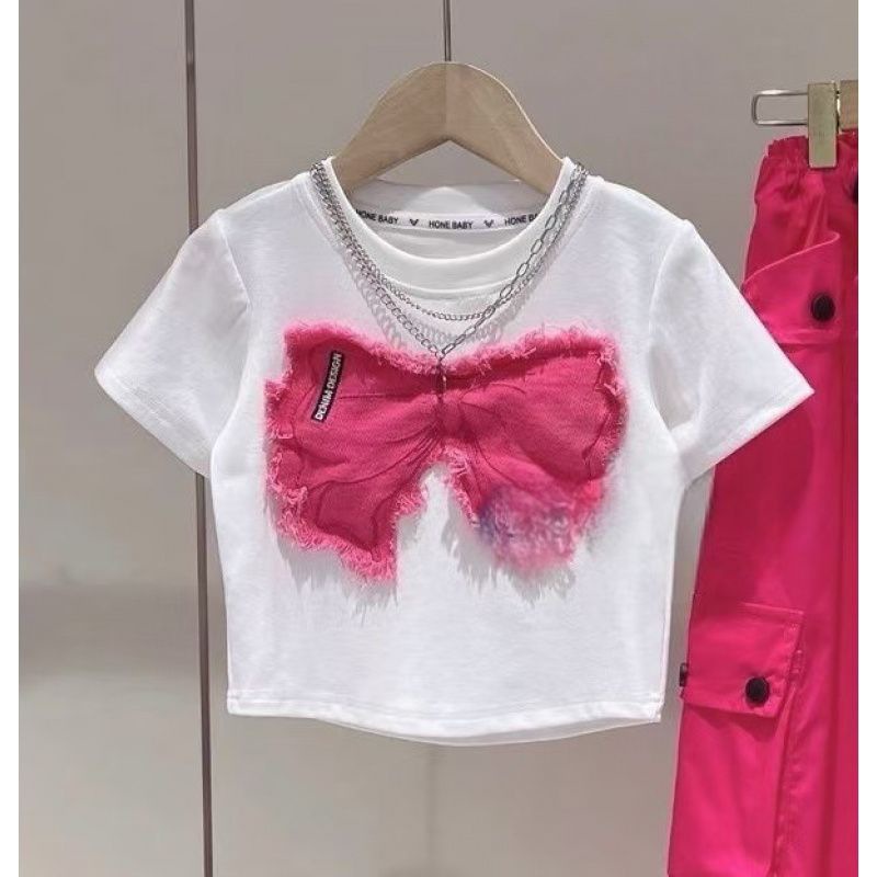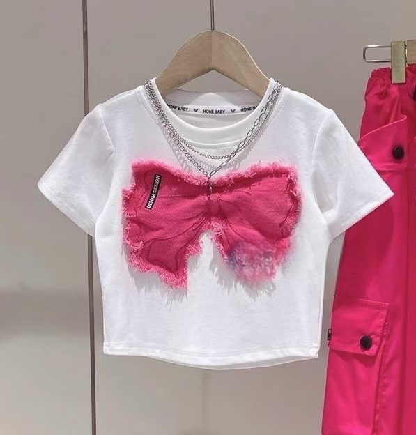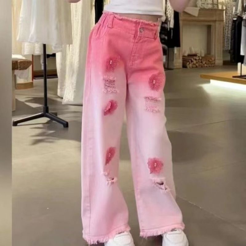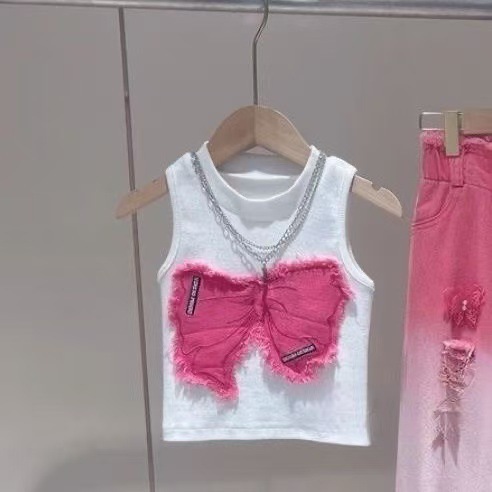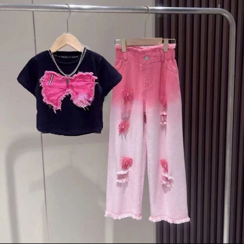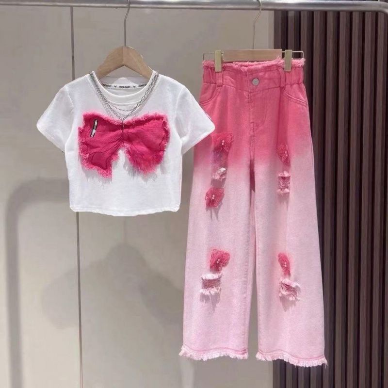 . 여아 그라데이션 슈트 2025 여아 패셔너블 티셔츠 찢어진 청바지 도파민 웨어 투피스 여름 세트스토어 가기