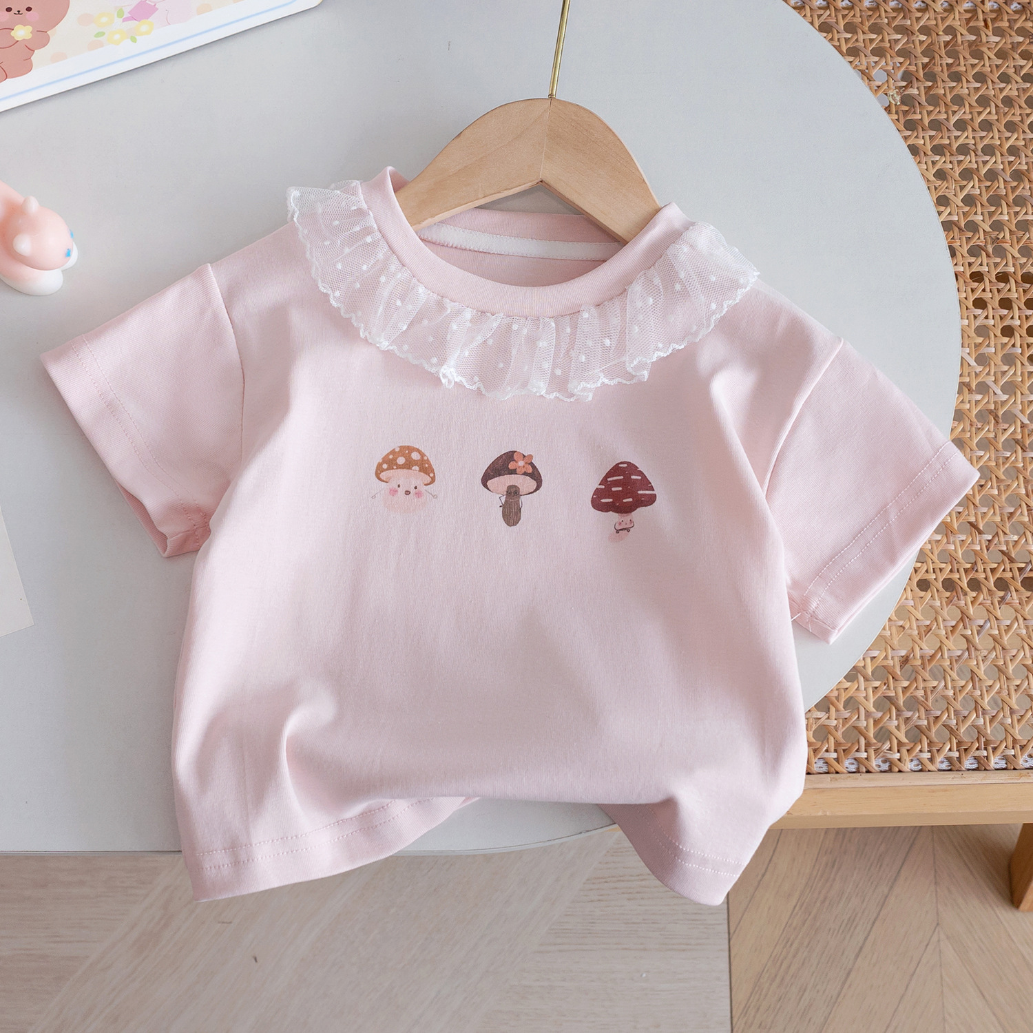 여자 귀여운 반팔 티셔츠 25 여름 새 스타일 레이스 반팔 아기 소녀 달콤한 다목적 만화 탑스토어 가기