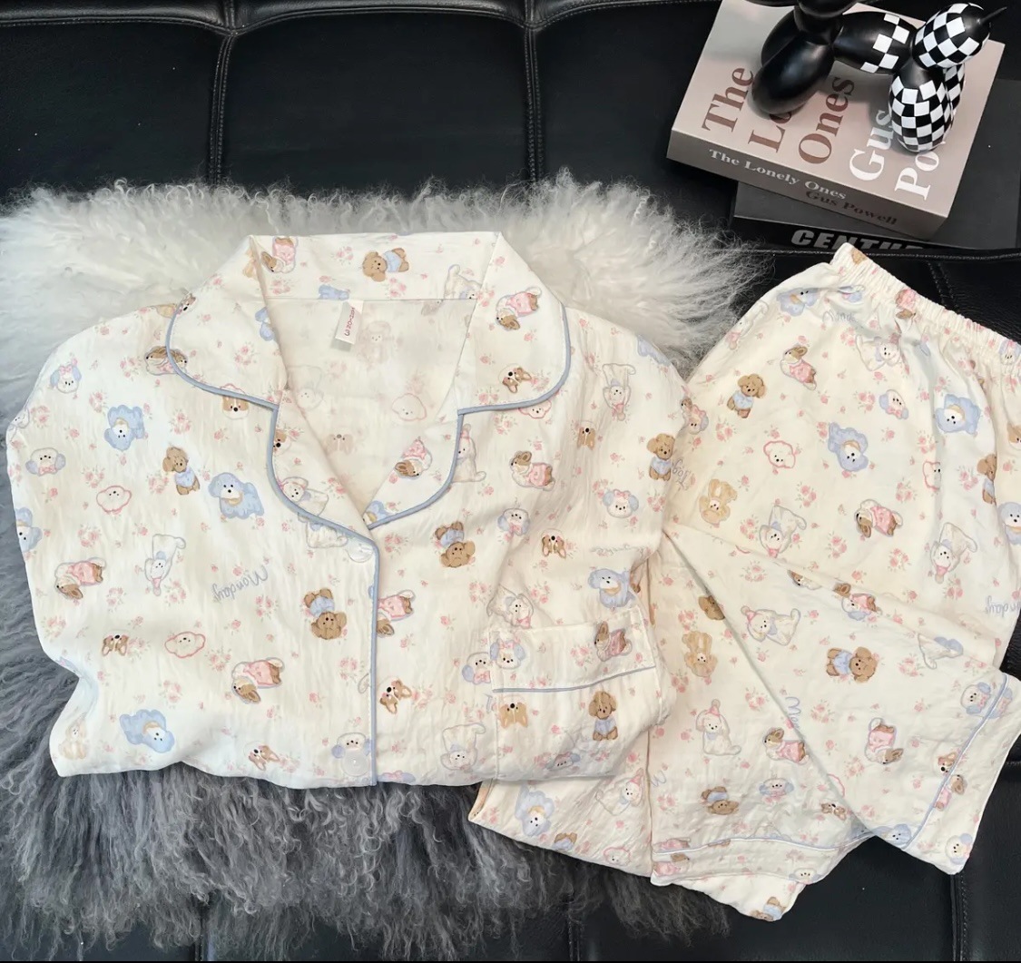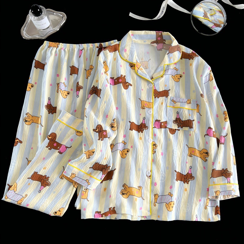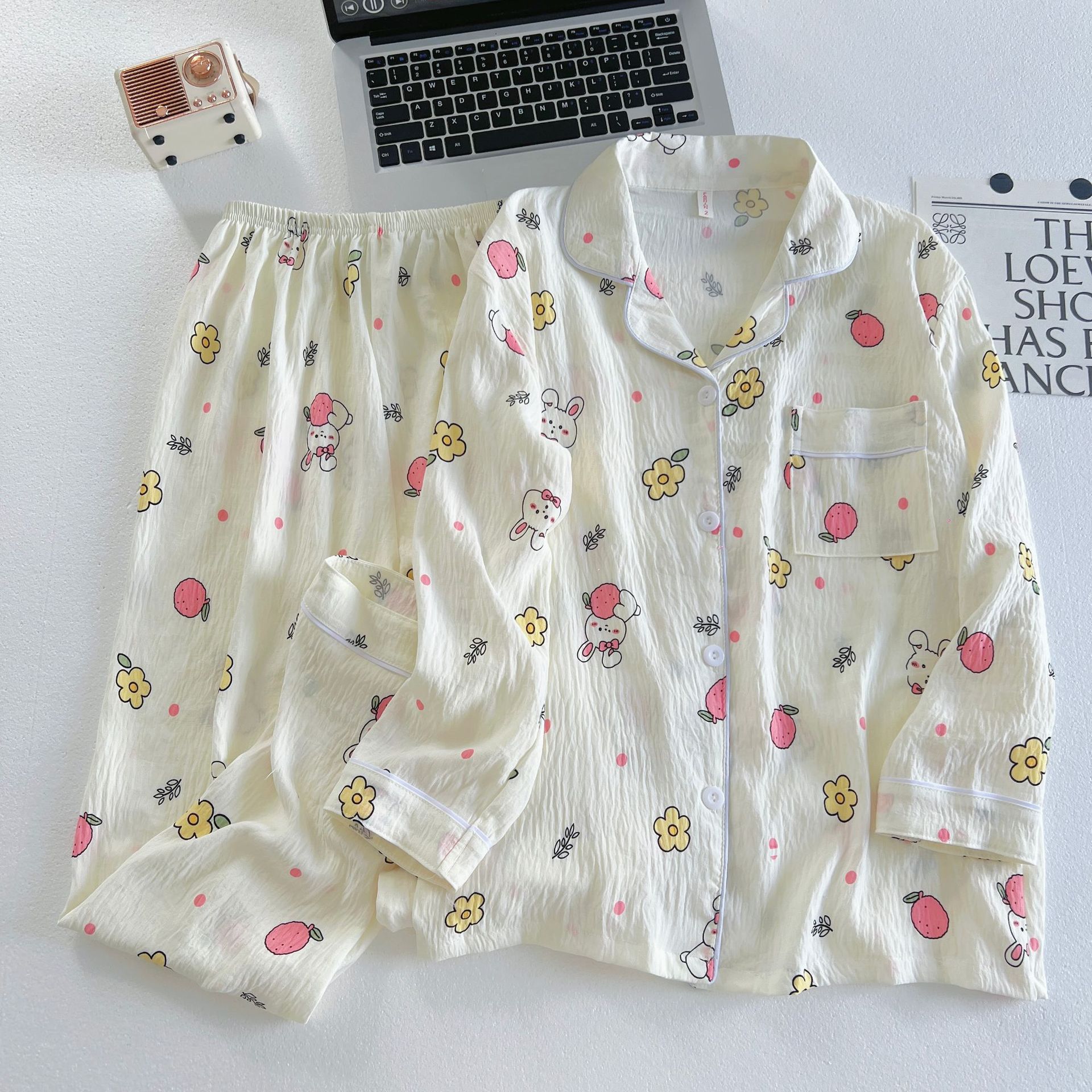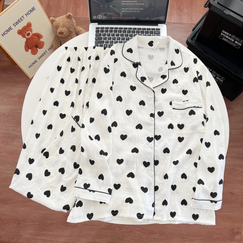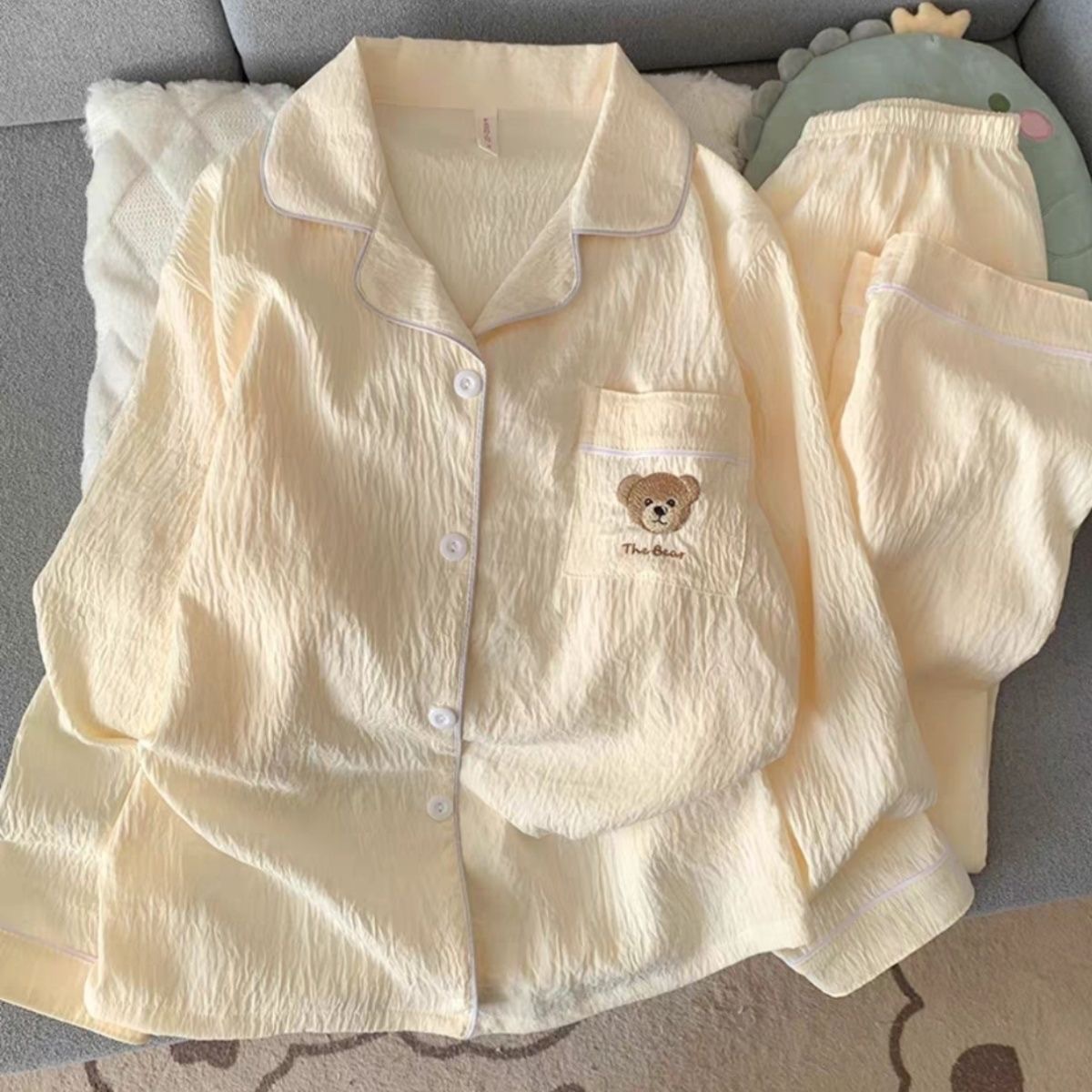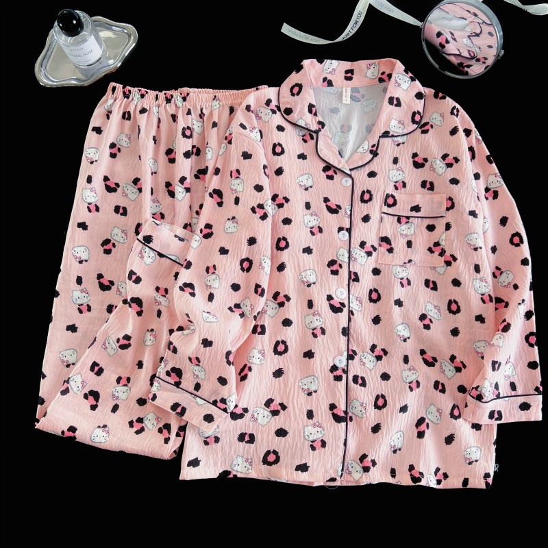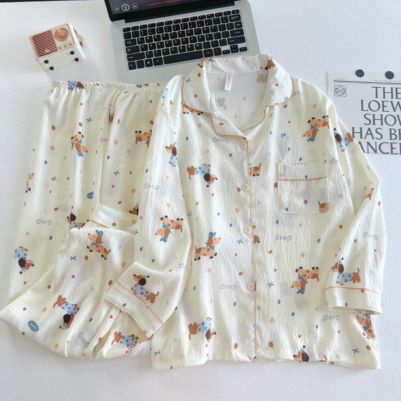 여성을위한 국경 간 실물 잠옷 봄, 가을 클라우드 코튼 라펠 카디건 긴팔 바지 느슨한 달콤한 홈웨어 세트