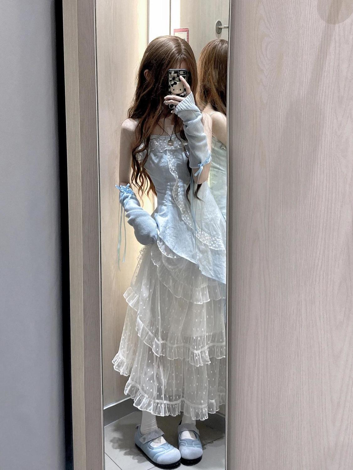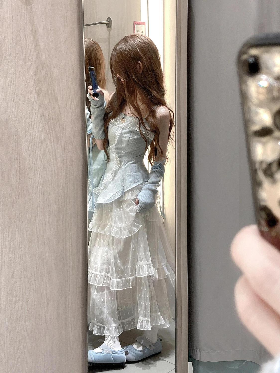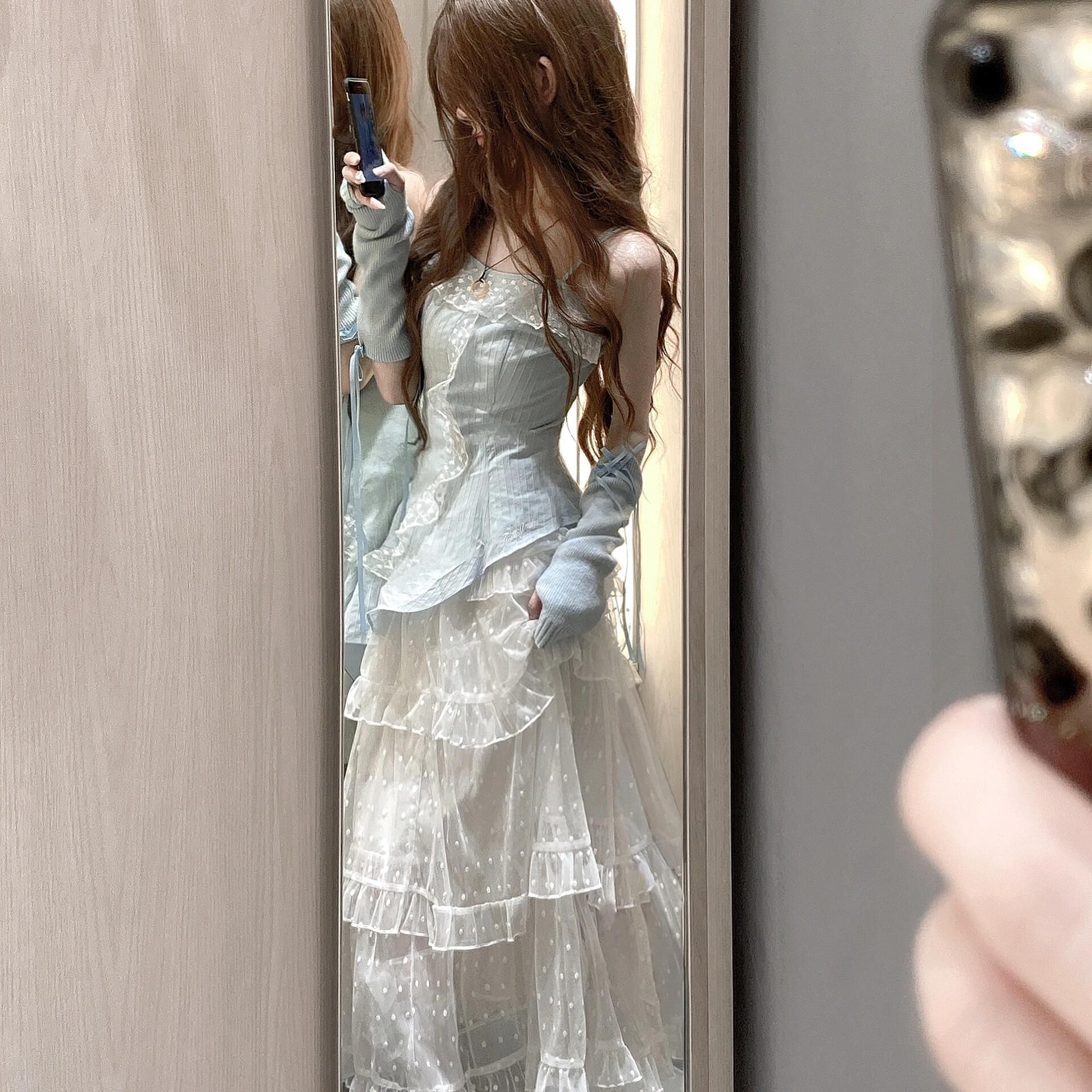 스커트 투피스 슈트 러플 서스펜더 탑 드레스 여성스러운 스위트 케이크 쉬폰 스커트 섹시스토어 가기