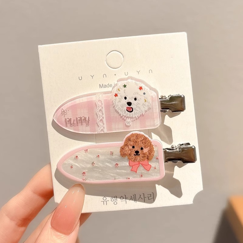• 카툰 강아지 머리핀 - 핑크 [한 쌍, 카드 포함]