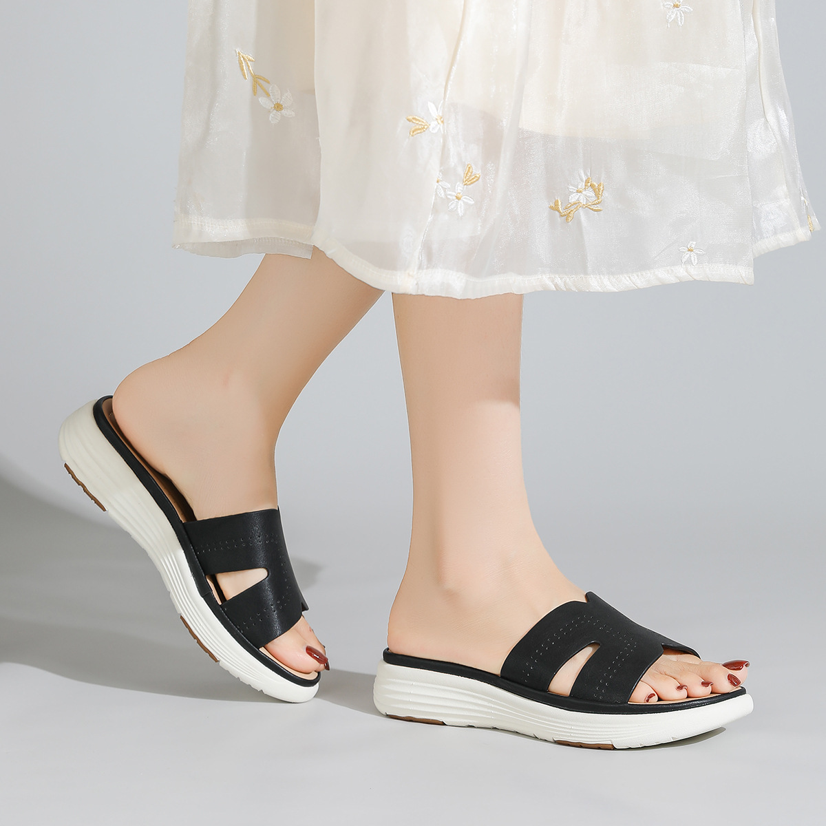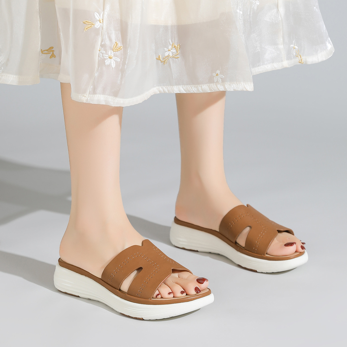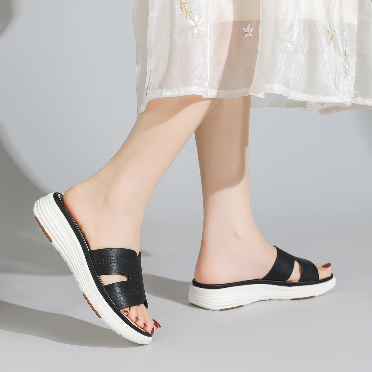 대외 무역 편안함 ~ 여성을위한 중공 통기성 두꺼운 밑창 샌들 여름 새 물고기 입 슬리퍼 중간 굽 3.5cm 여성 신발스토어 가기