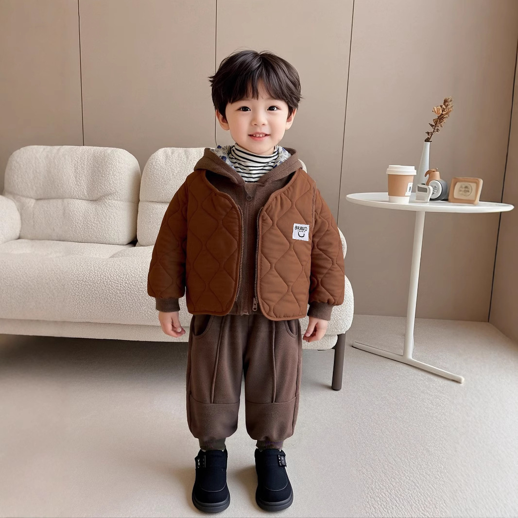 소년 겨울 벨벳 3 피스 세트 2025 새로운 어린이 1 가을, 겨울 베이비 솔리드 컬러 0-5 세 후드 코튼 코트